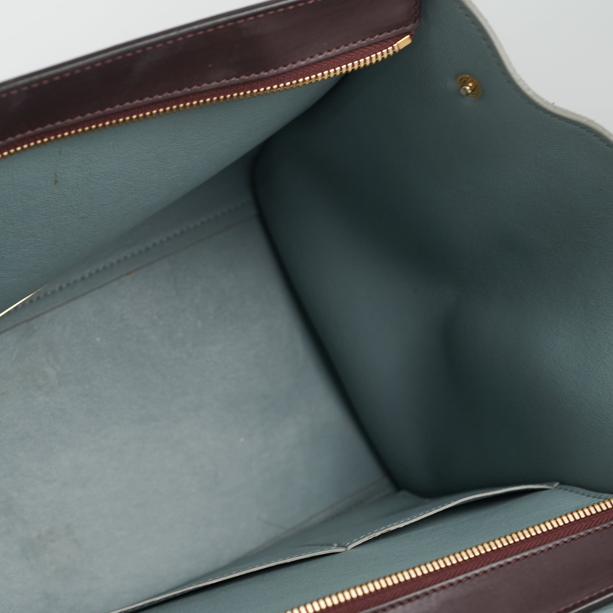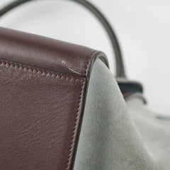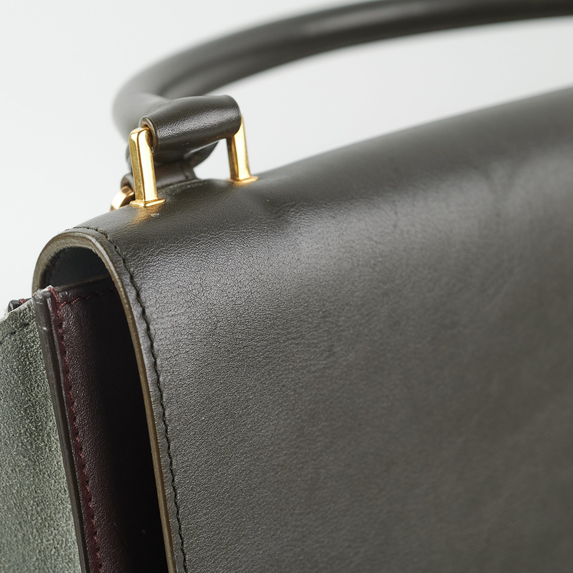 Light hairline scratches on hardware, light nail marks on leather, slight pilling on suede sides, light stains on interior and base, slight cracking around piping of bag