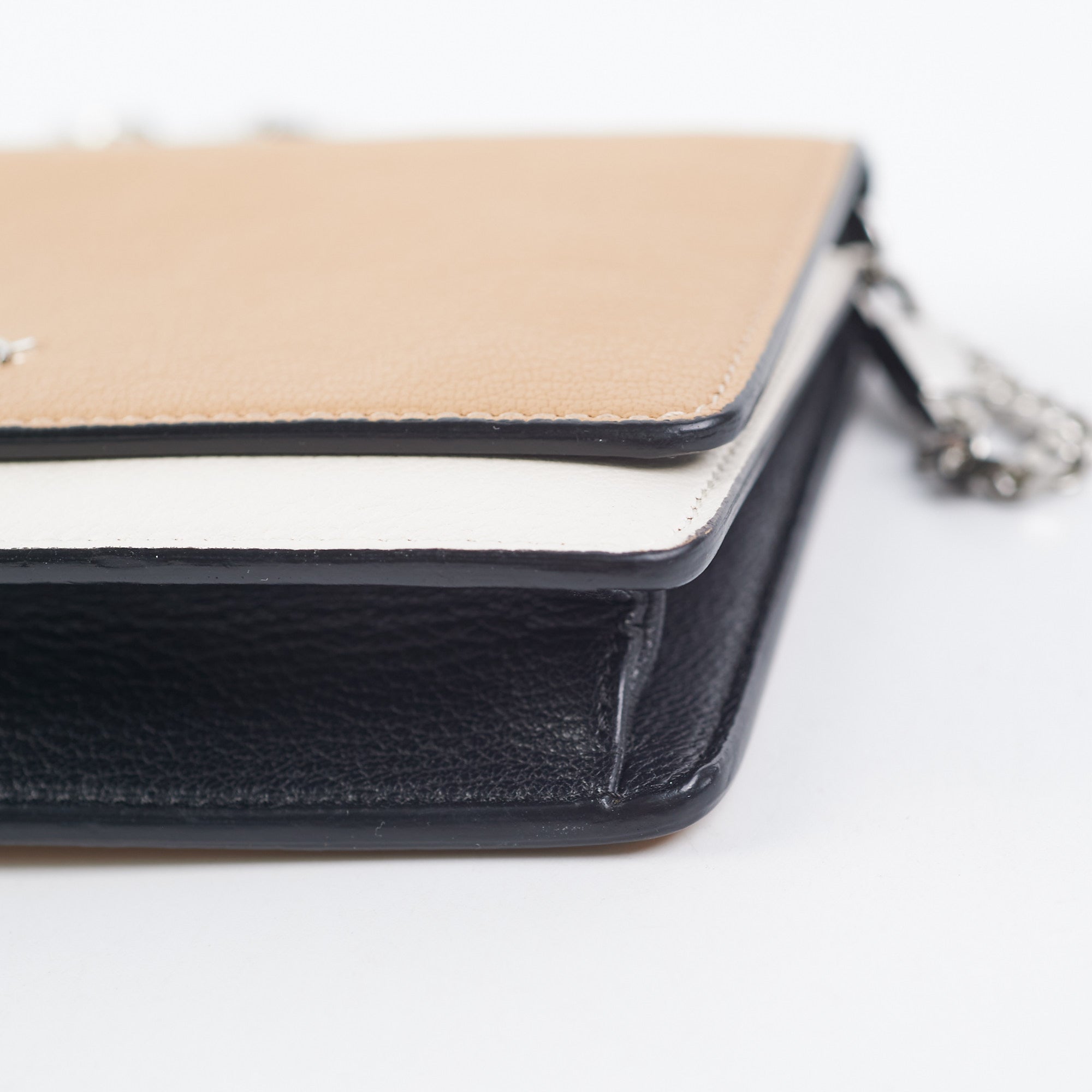 Light nail marks under flap, light colour transfer on white leather under button