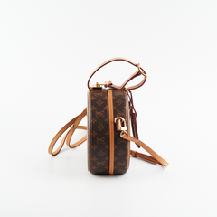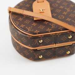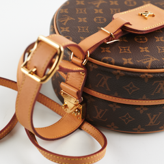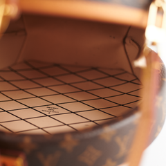 Interior leather partially detached, tarnishing on hardware/colour transfer on leather tabs where straps attach, minor wear on vachetta leather, small marks on interior