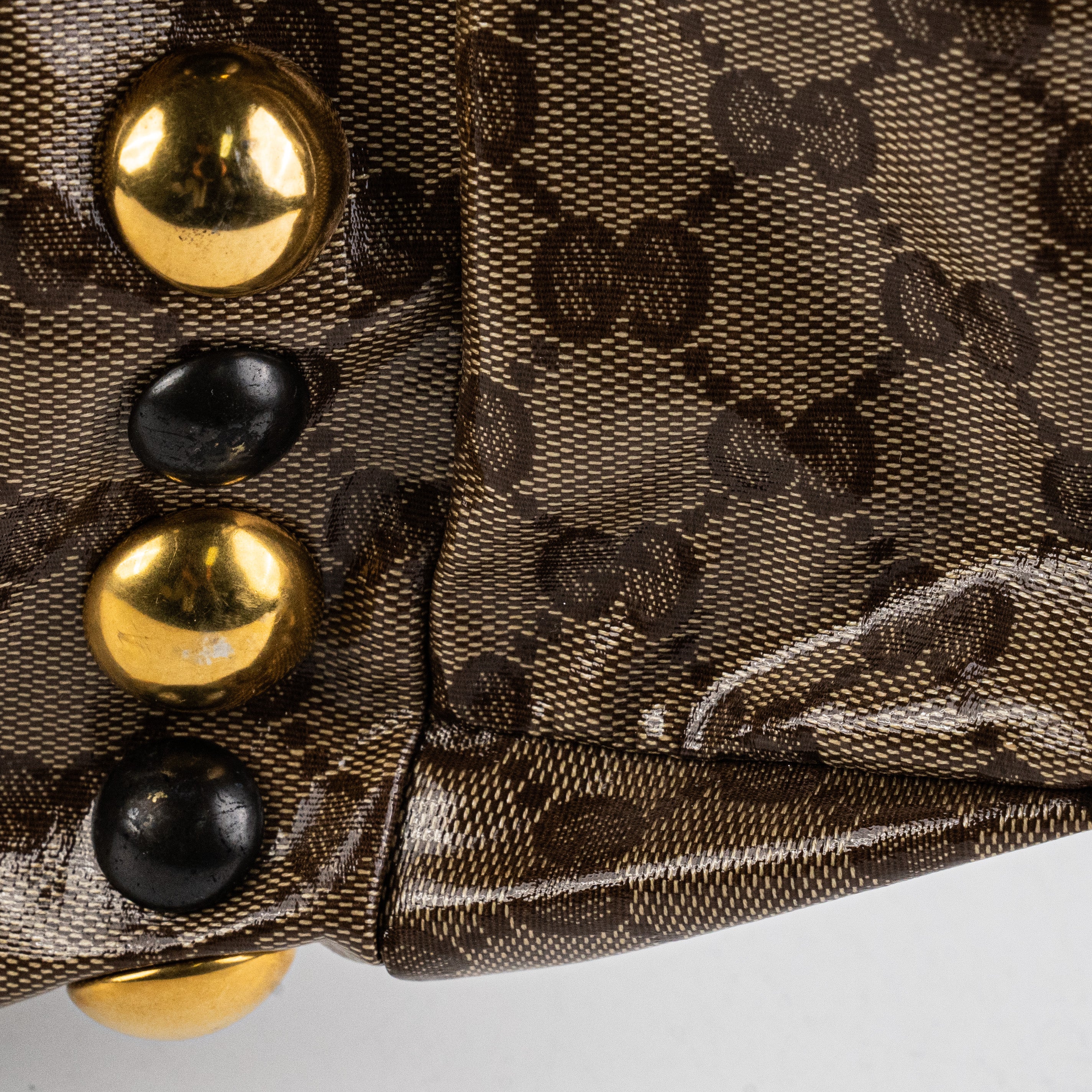 Signs of wear throughout, light hairline scratches and tarnishing on hardware, light wear around opening edges and on front, rubbing on straps and corner, colour transfer throughout
