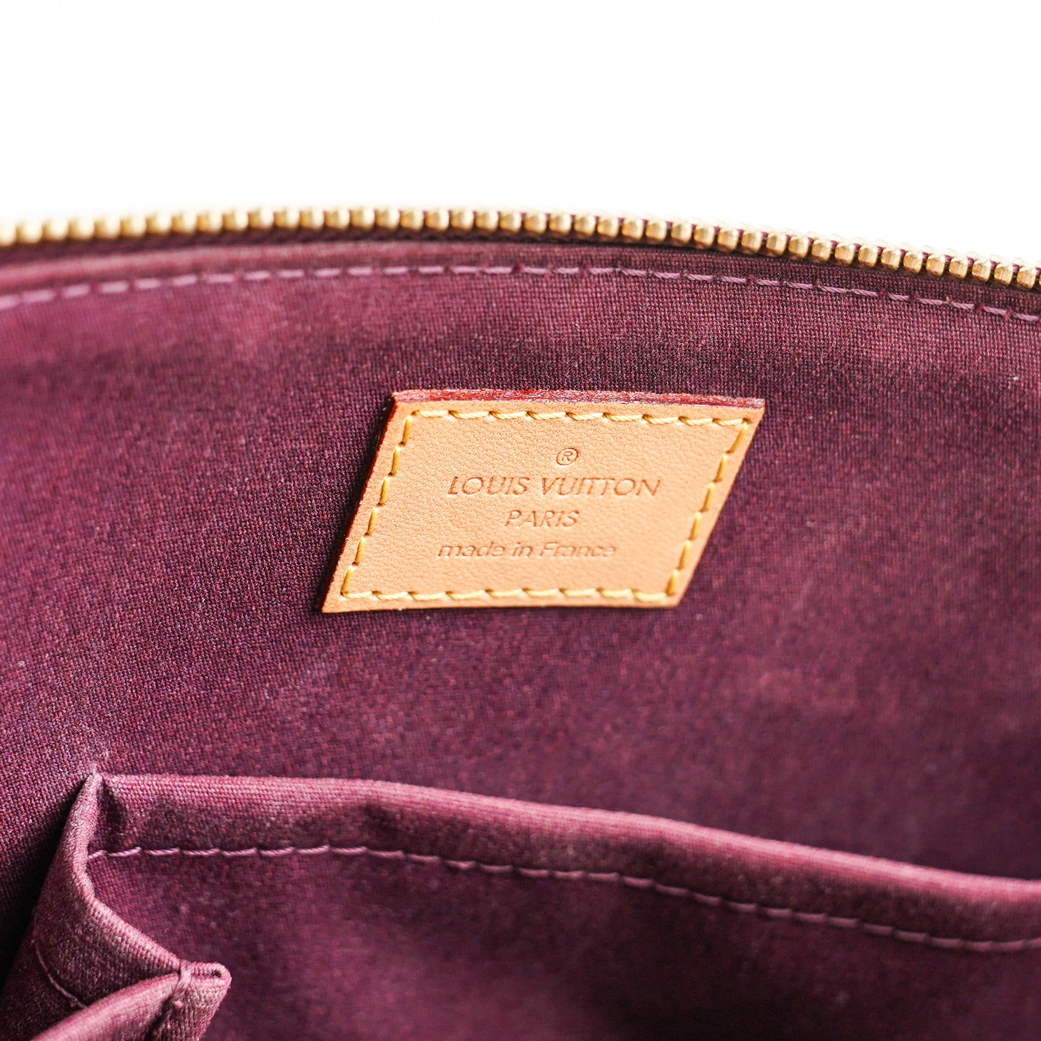 Hairline scratches on hardware, rubbing on corners, discolouration inner fabric, minor peeling near zipper