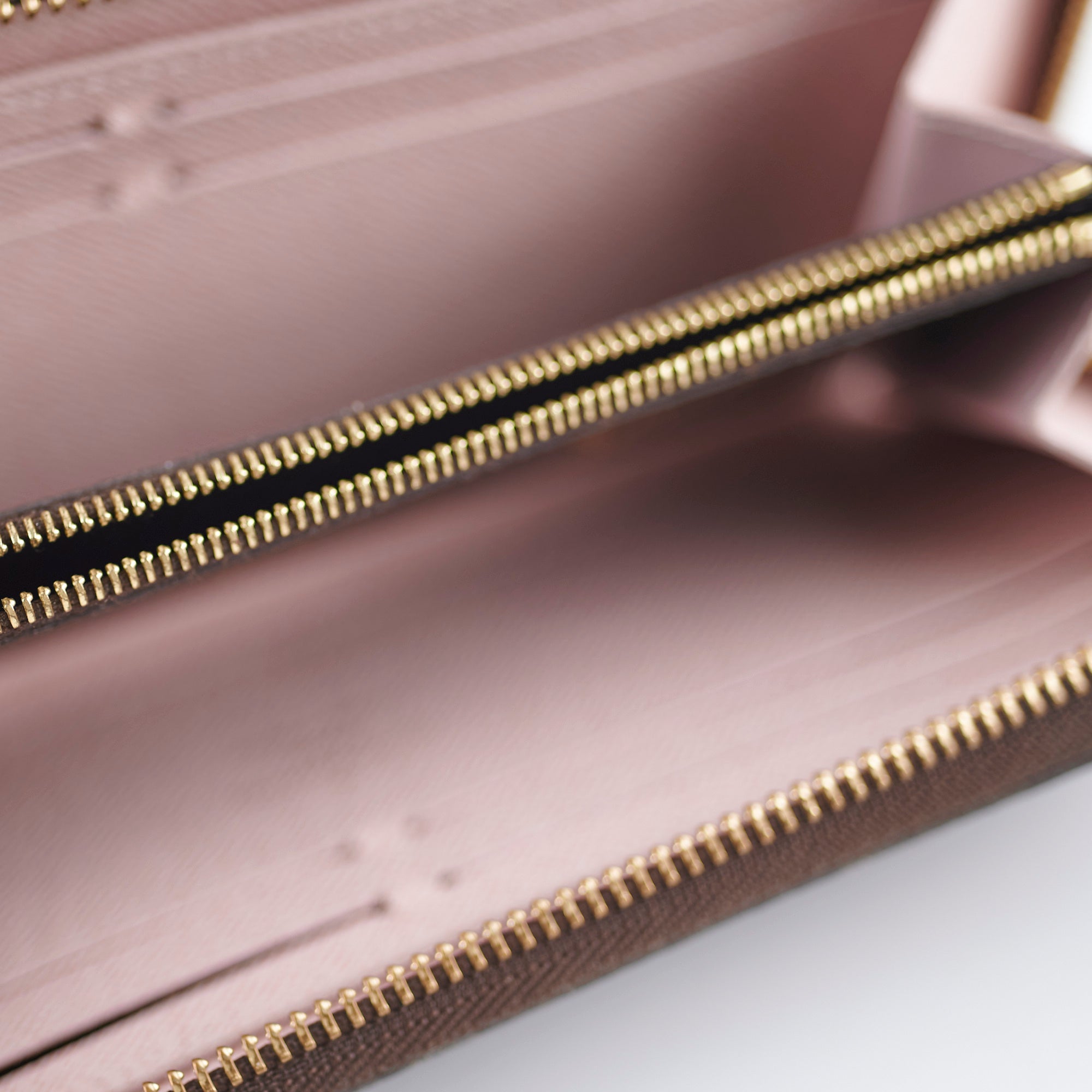 Light tarnishing on hardware, flaw on zipper leather, stains interior