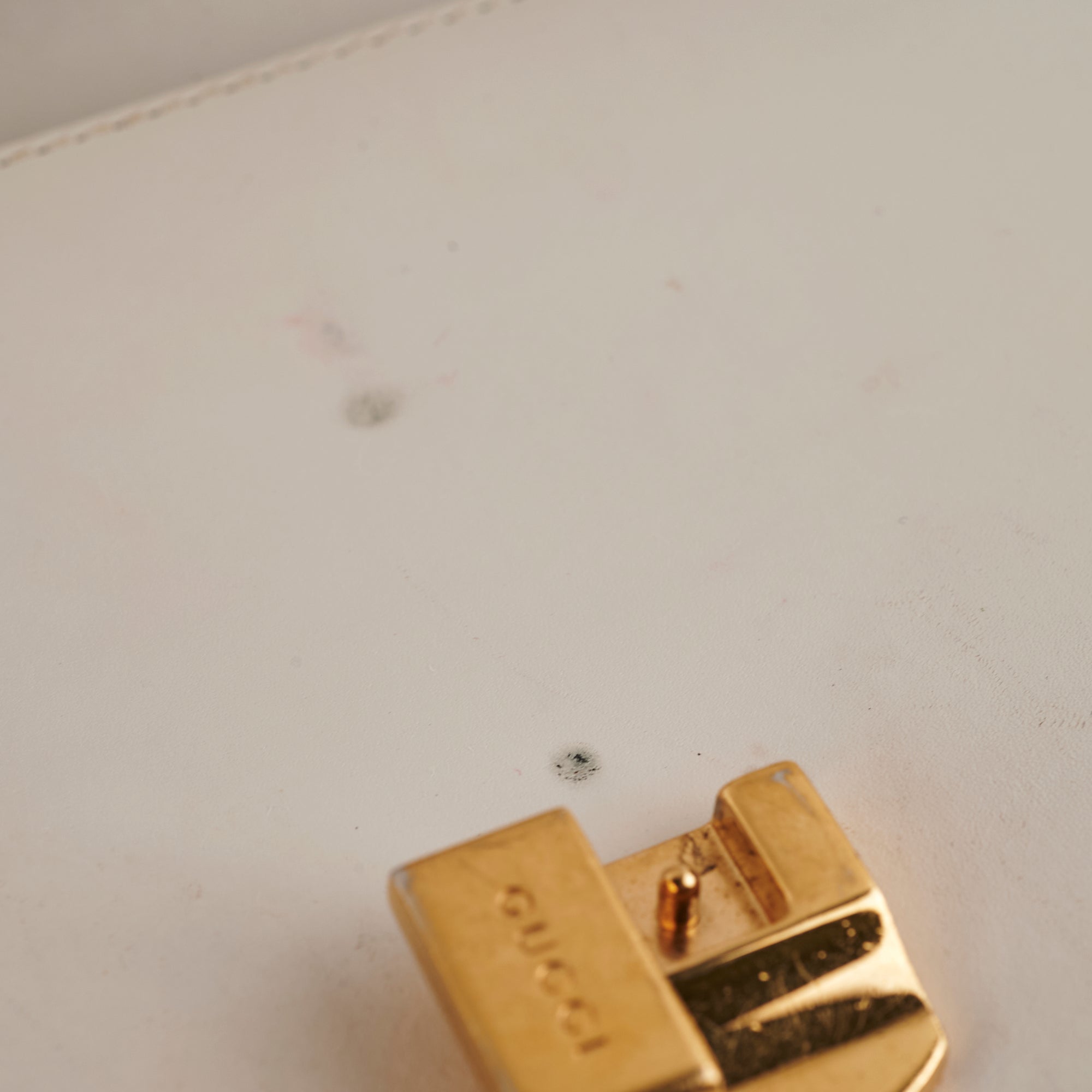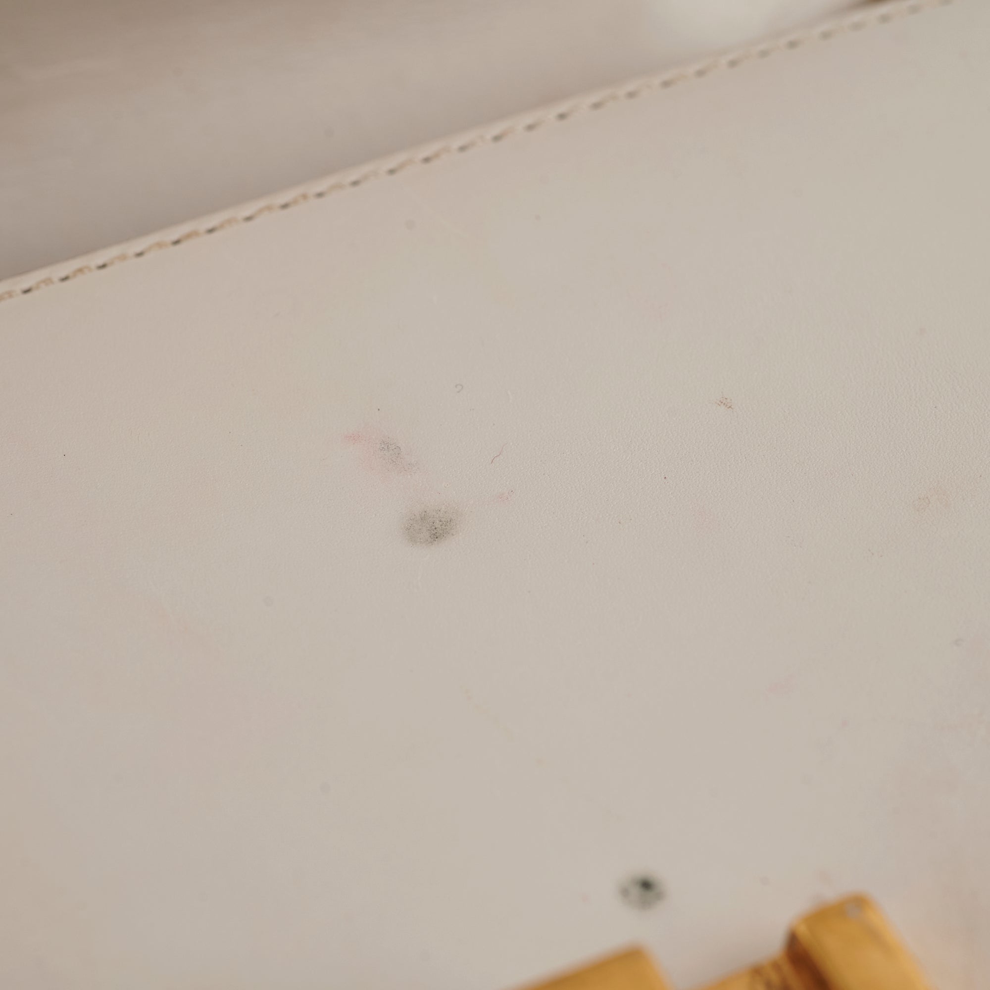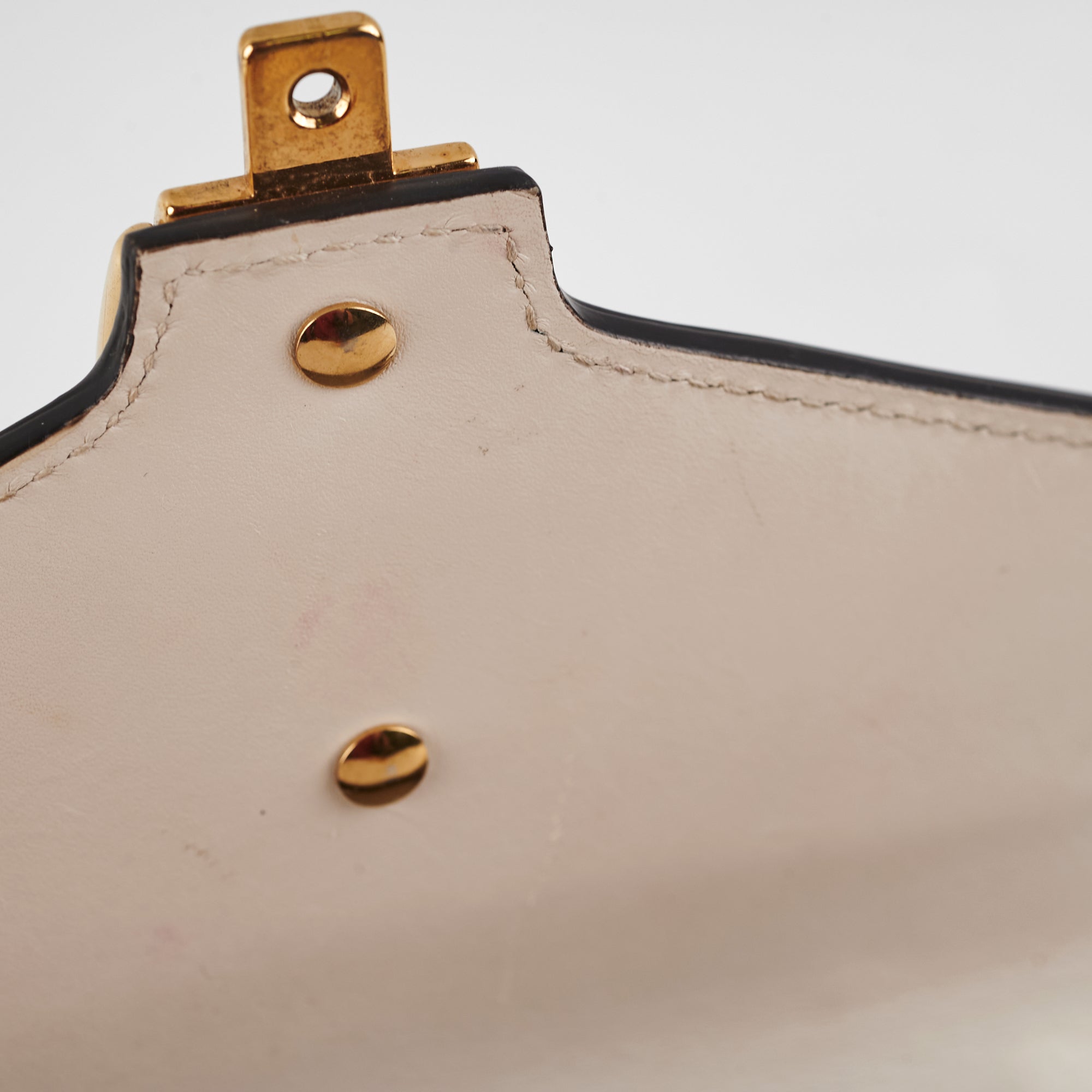 Tarnishing on hardware, scuffs throughout, rubbing on corners, marks/indents opening near clasp, minor stains interior, signs of wear throughout