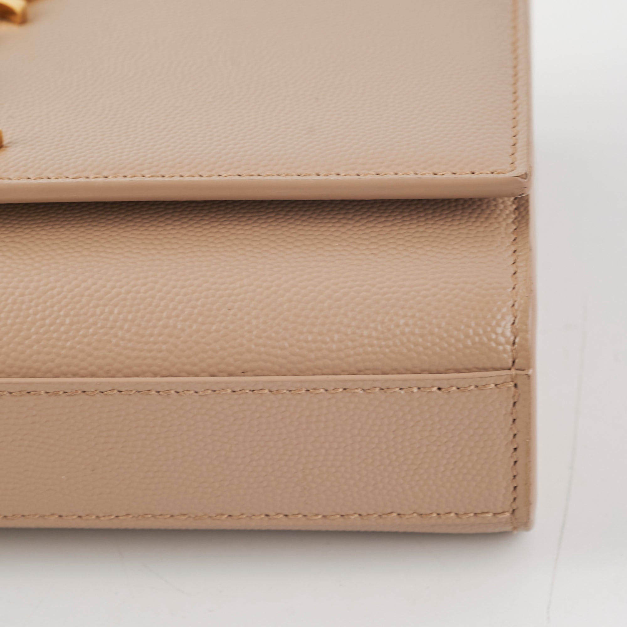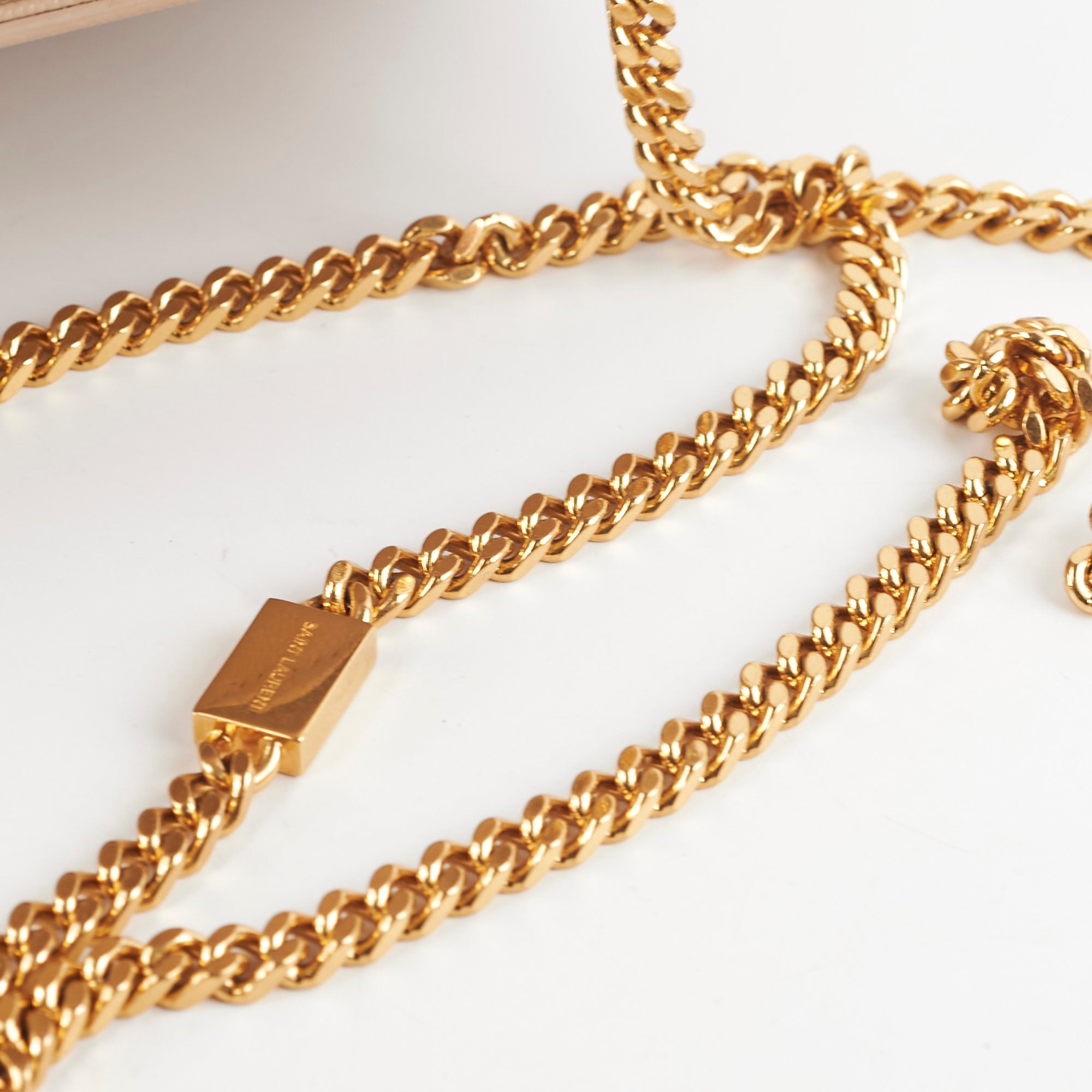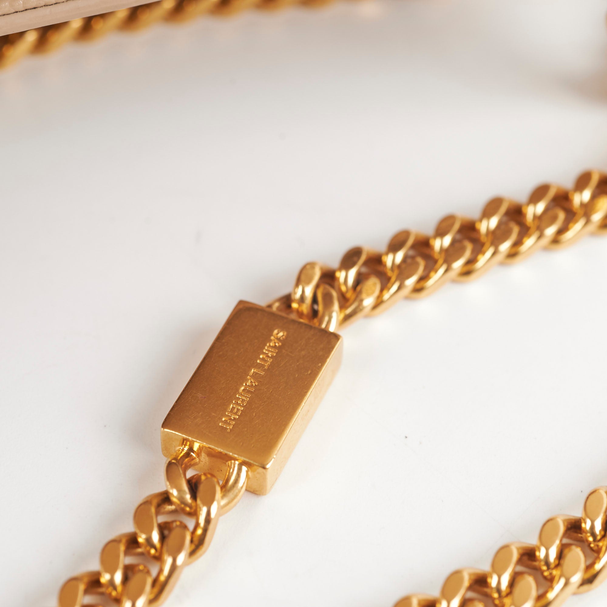 Hairline scratches on hardware, minor marks on side of bag near chain strap, light scuffs interior