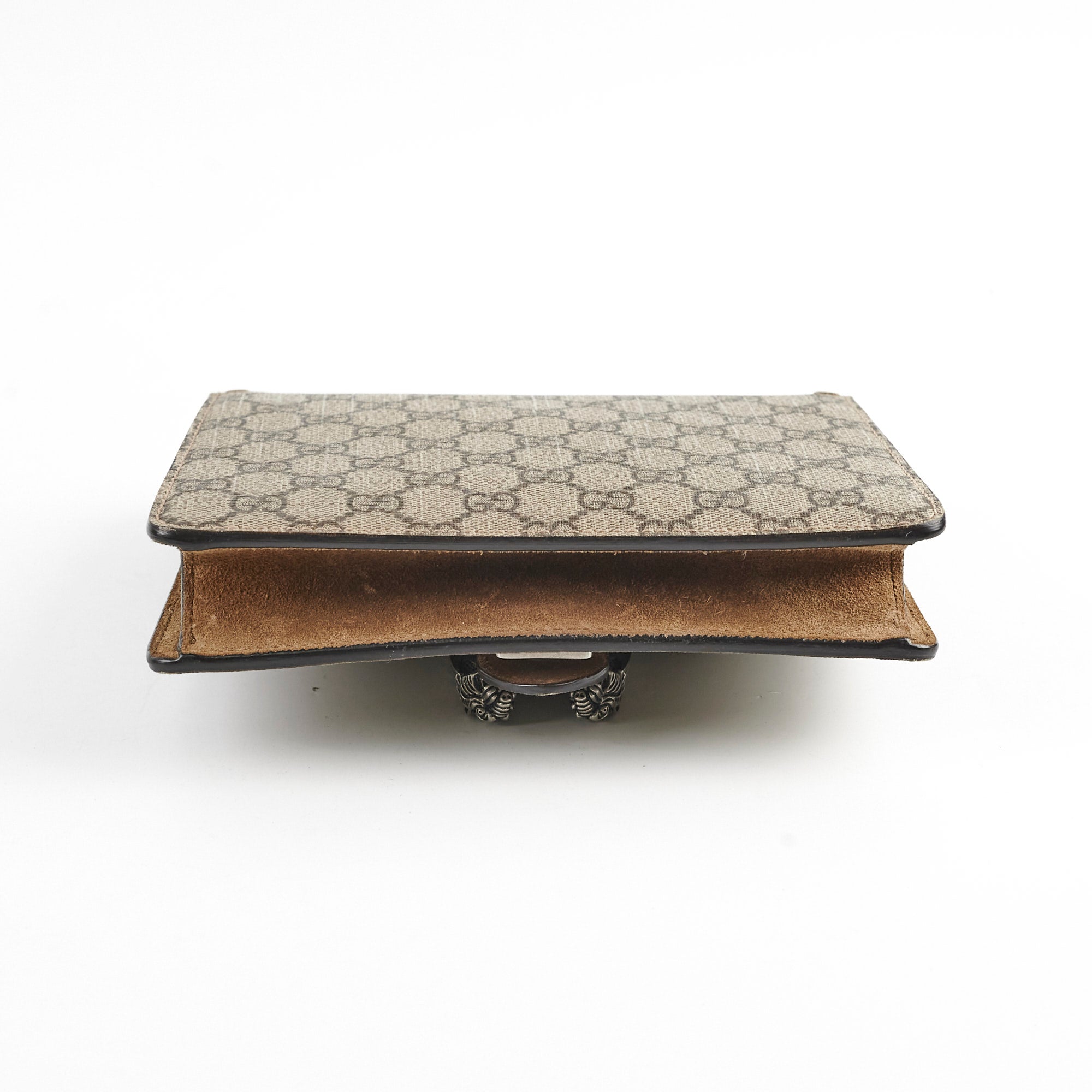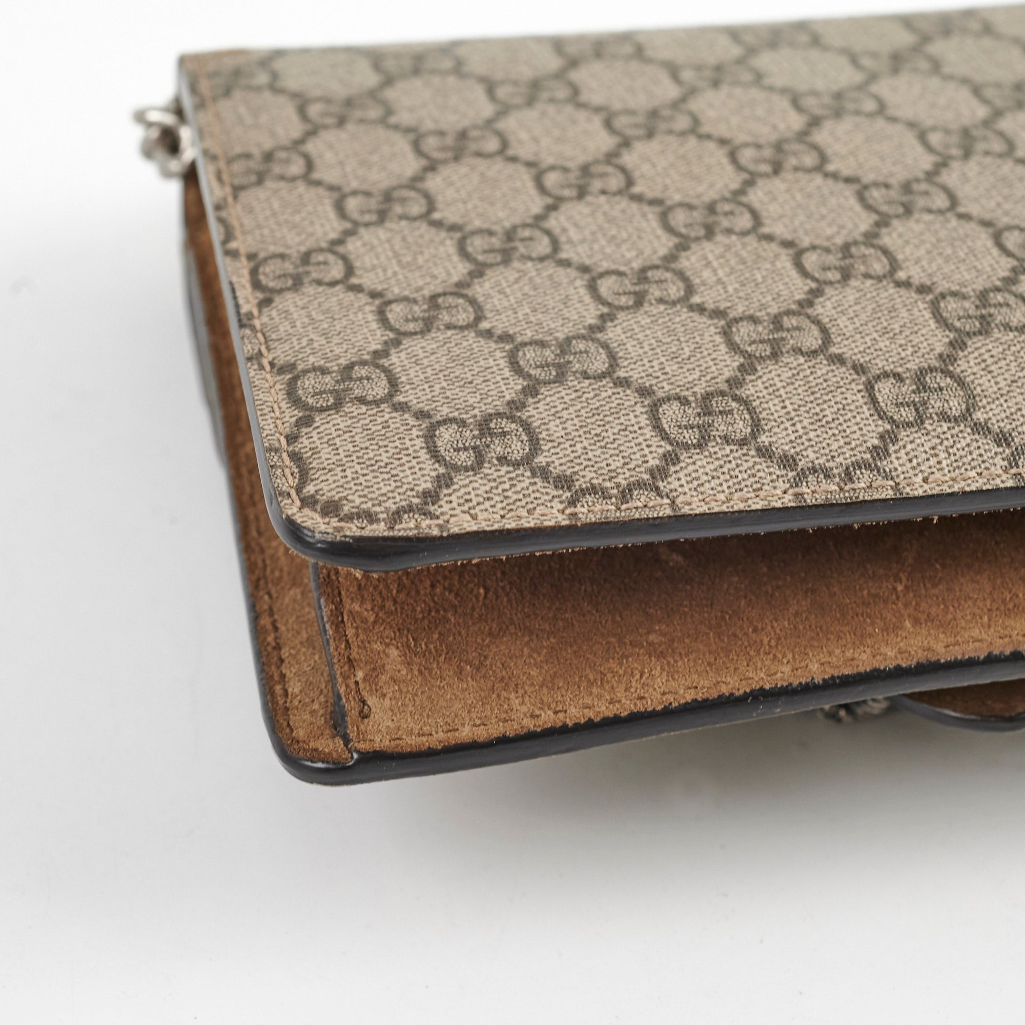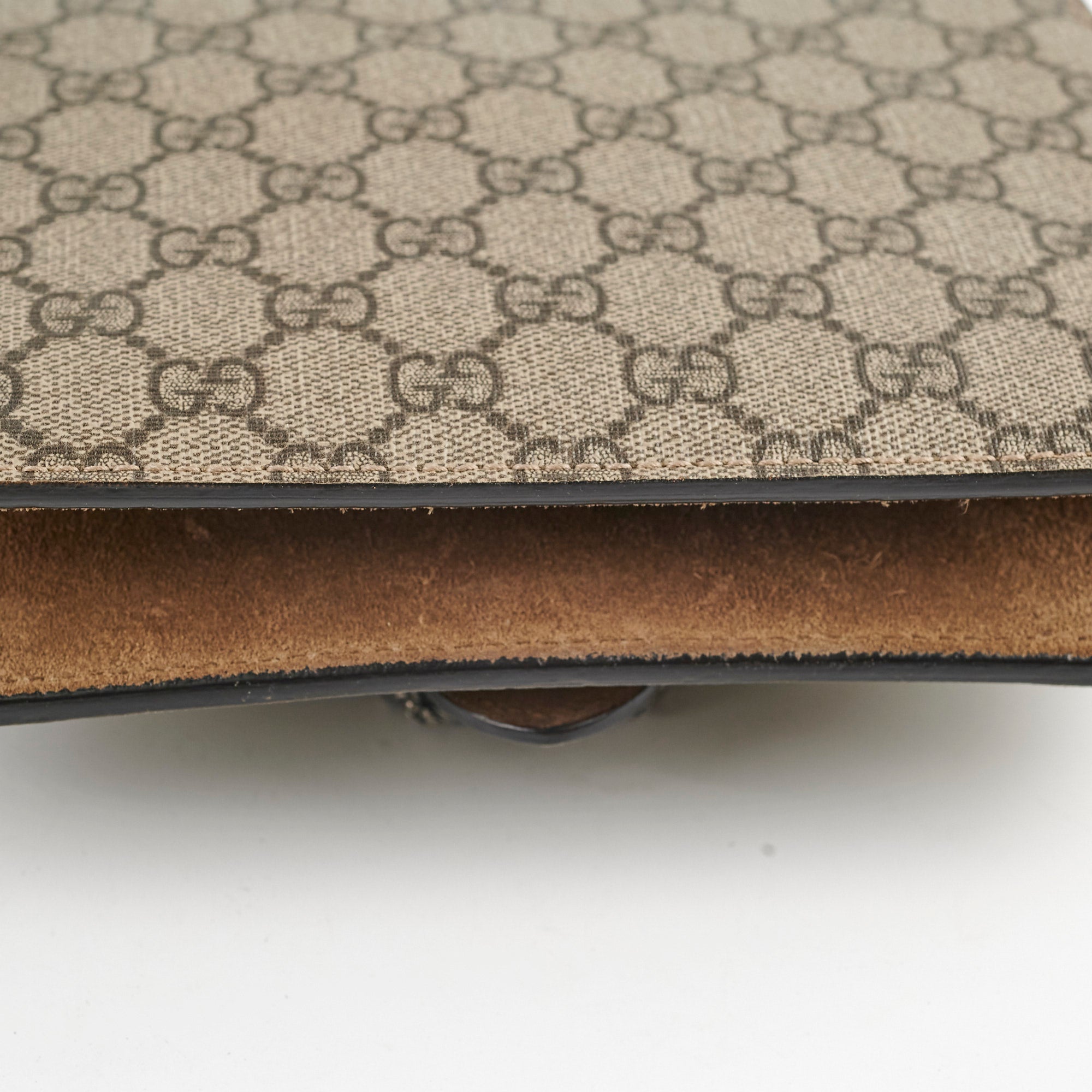 Minor discoloration interior flap, minor scuffs base, light indent interior flap