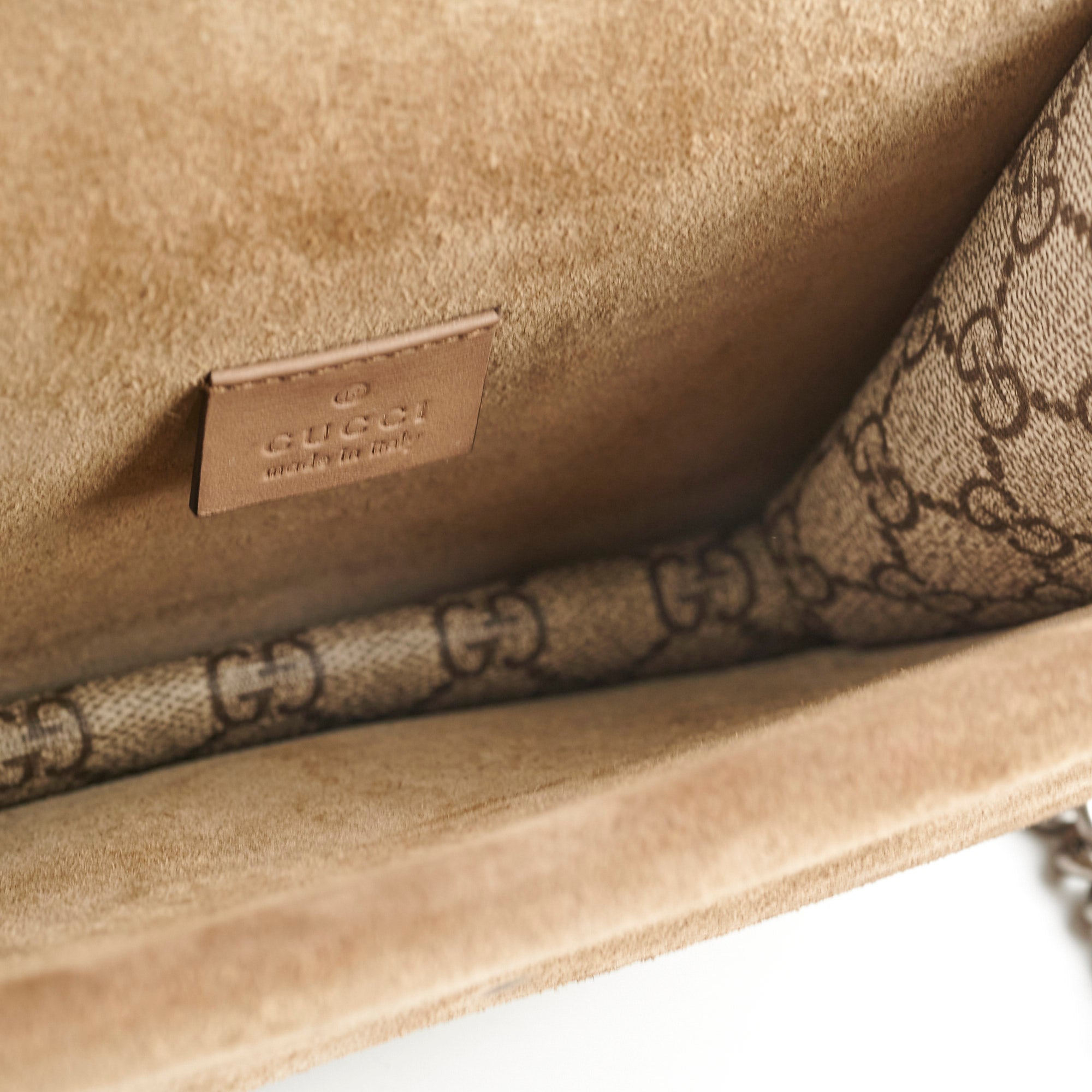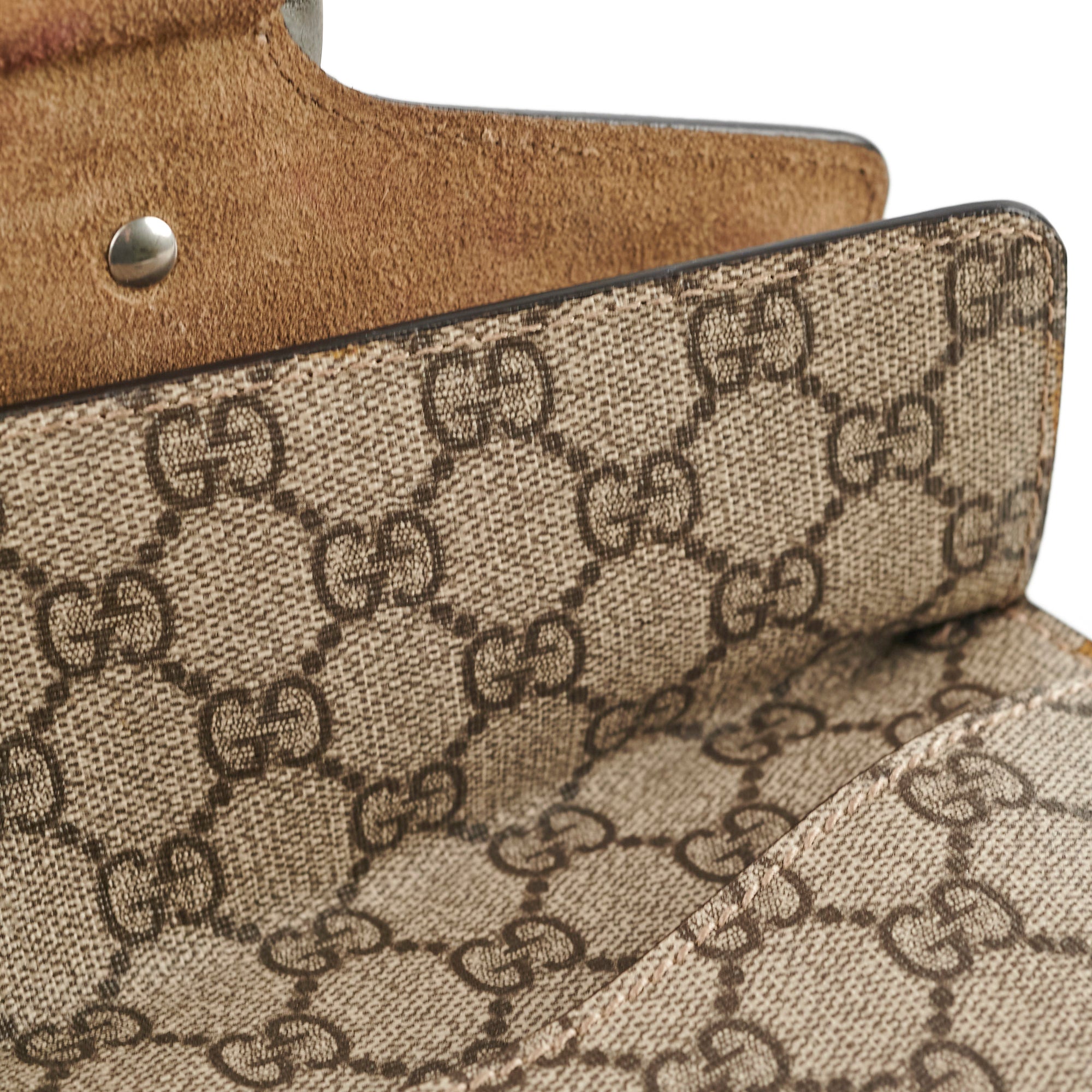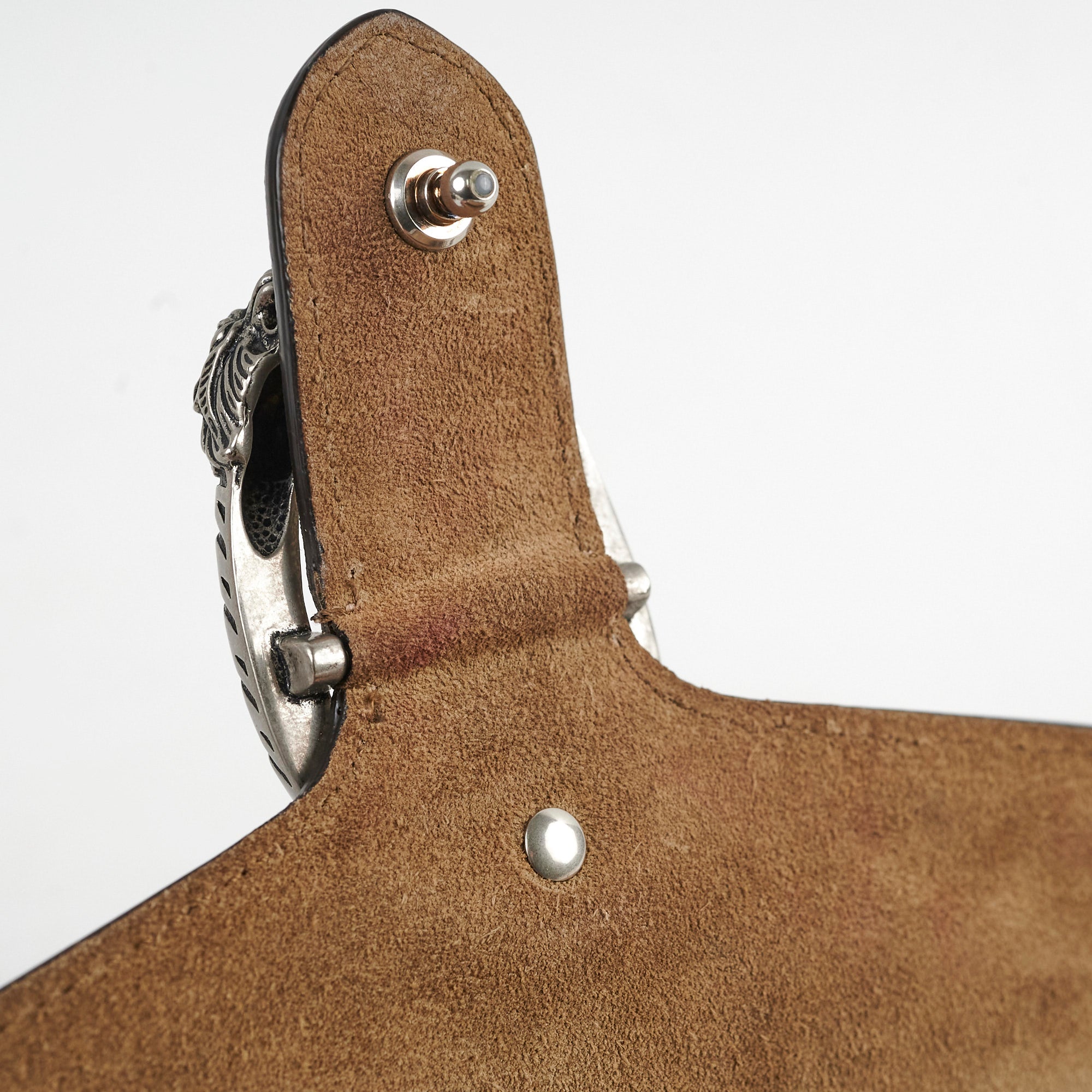 Minor discoloration interior flap, minor scuffs base, light indent interior flap