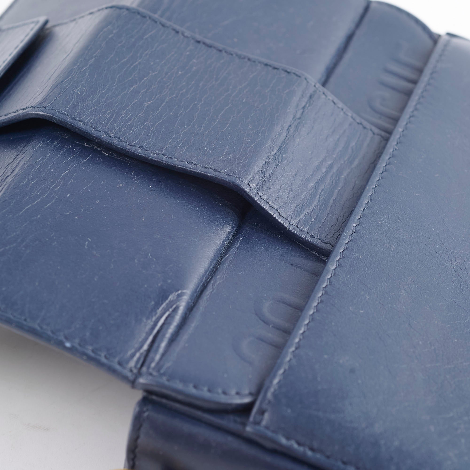 Dry leather hand feel, slightly wrinkling throughout, hardware fading