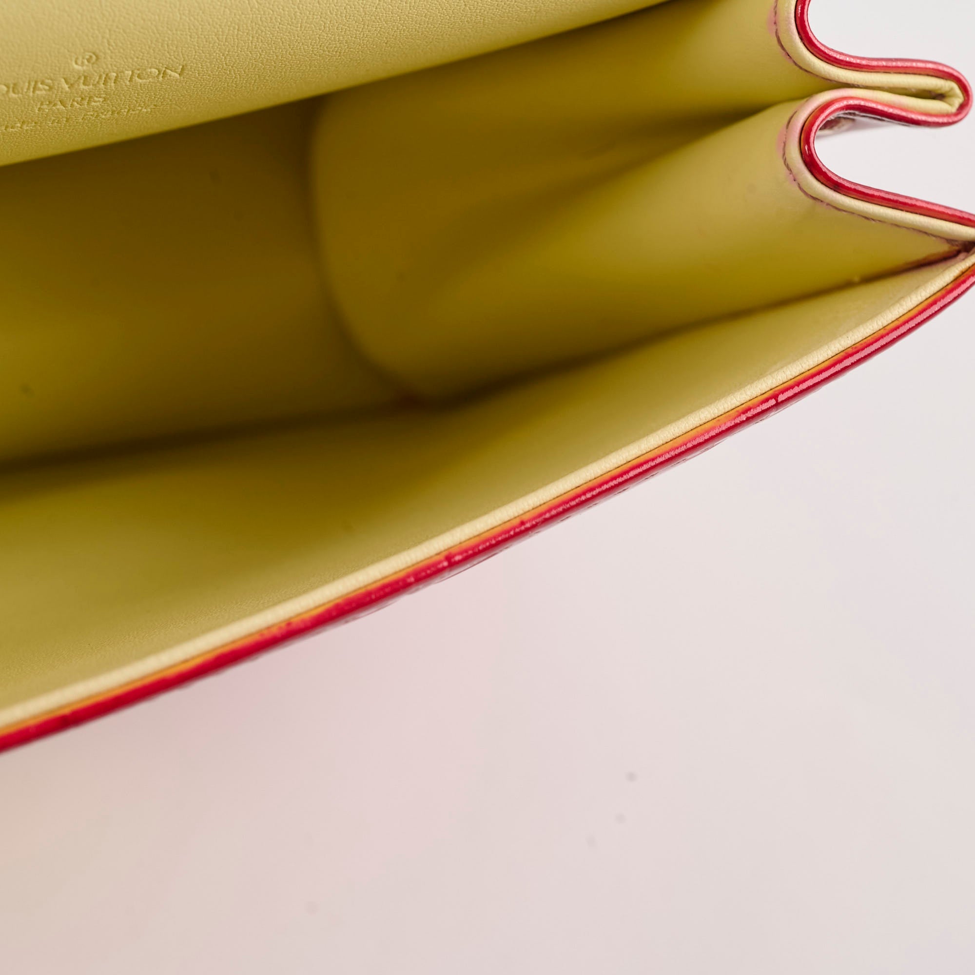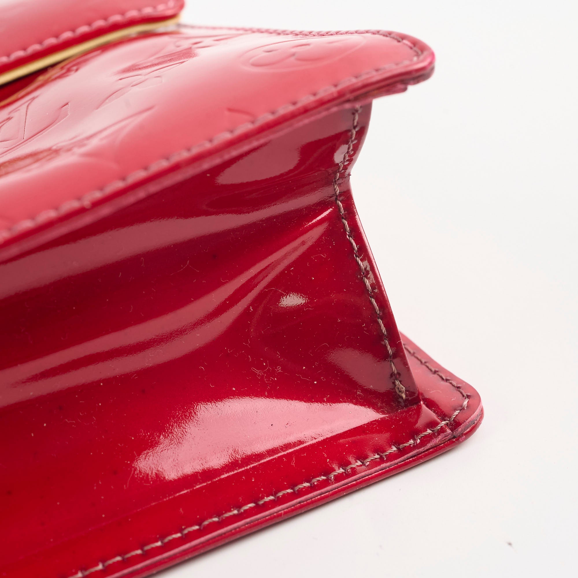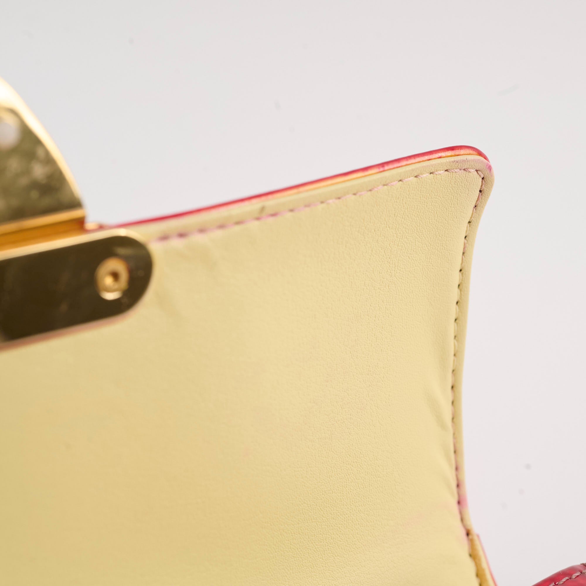 Discoloration over and under the flap, rubbing on corners, darken on vachetta leather, glue residue under the flap near the edge