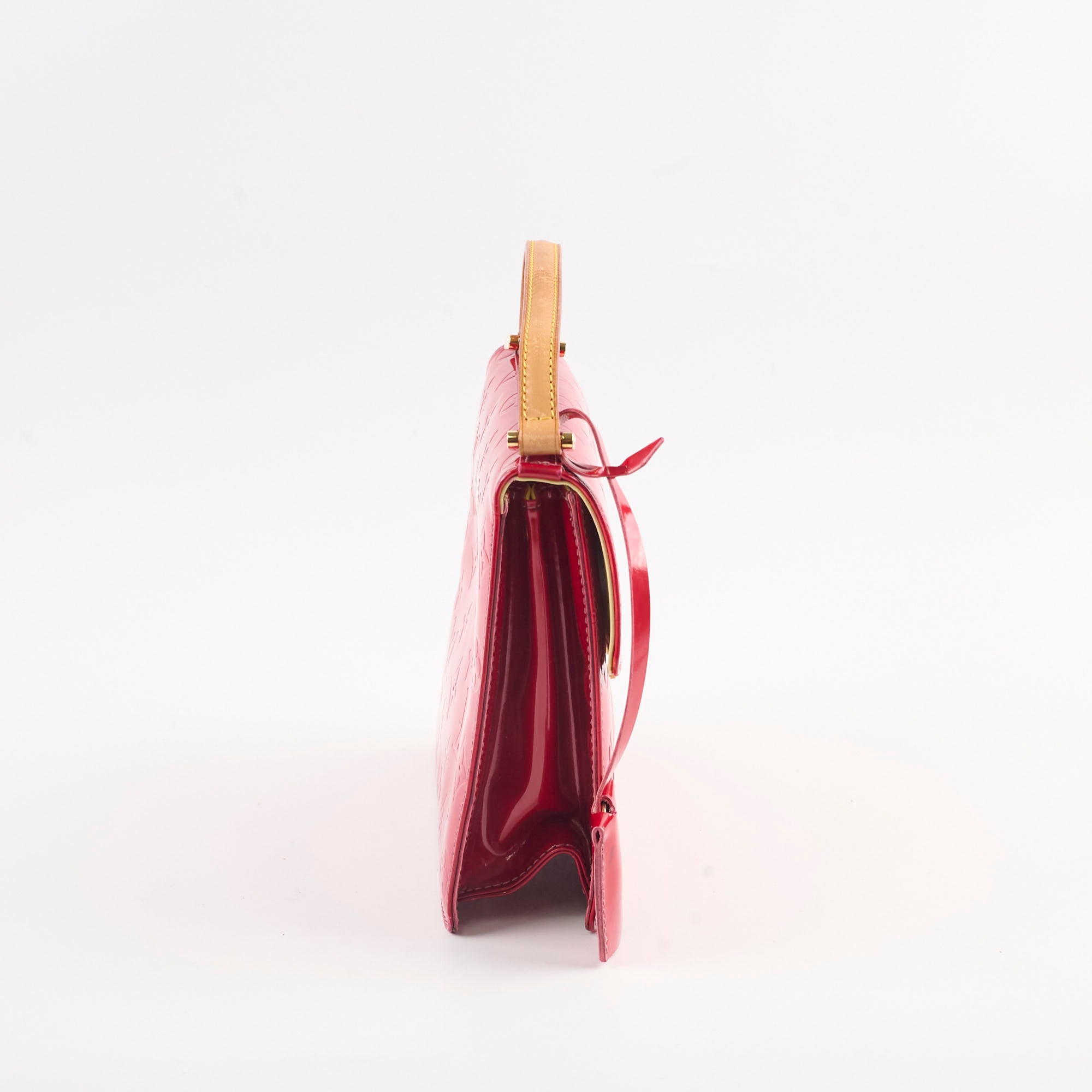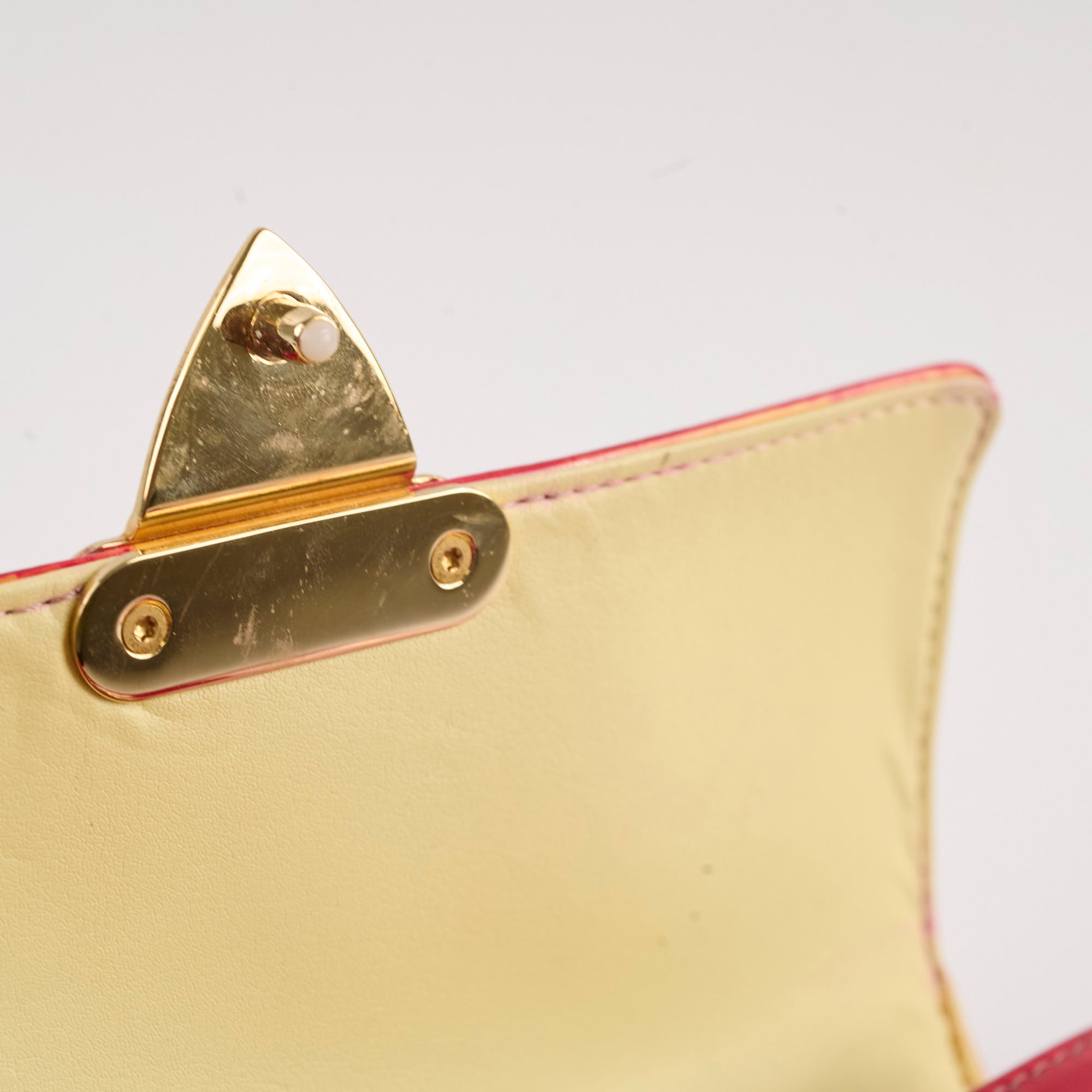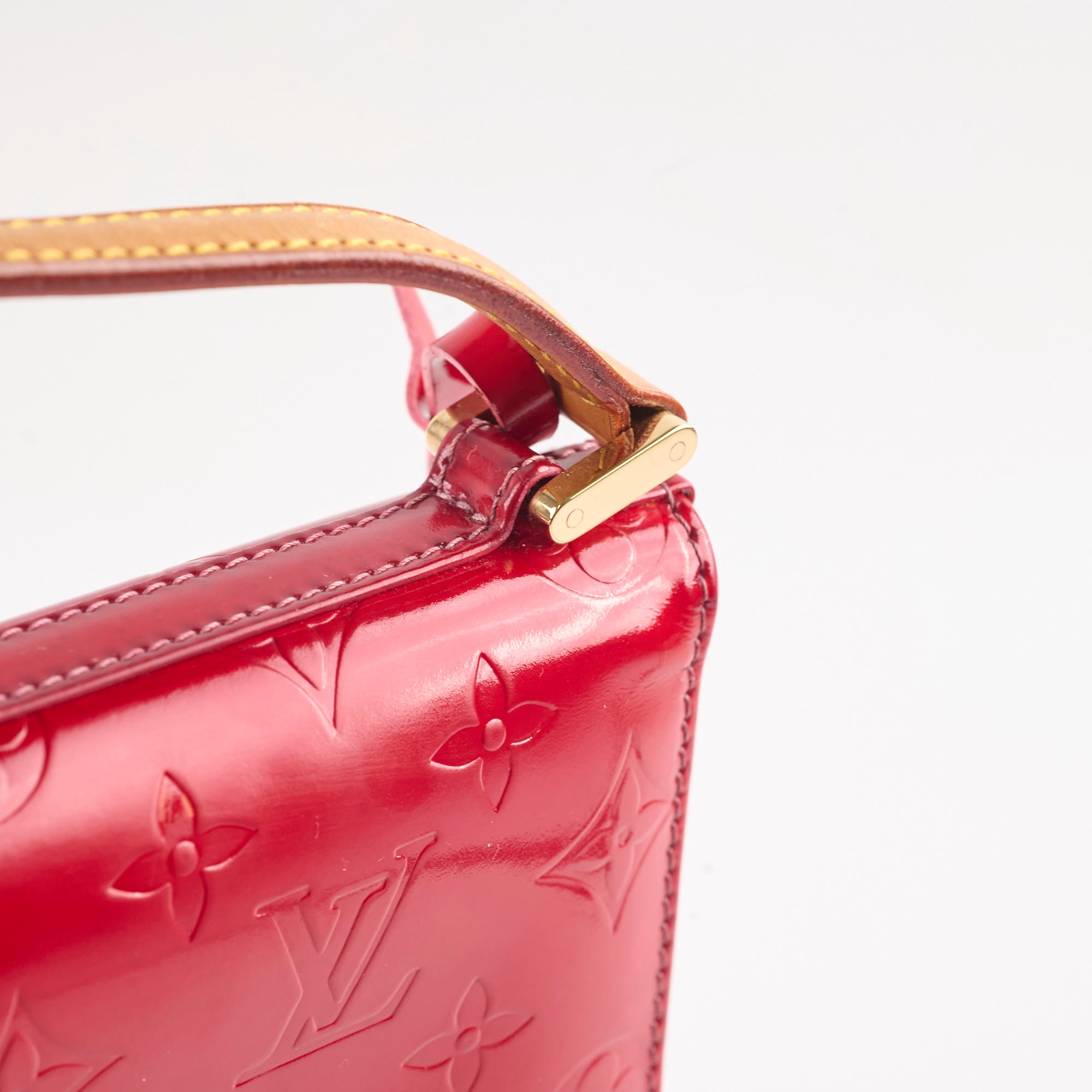 Discoloration over and under the flap, rubbing on corners, darken on vachetta leather, glue residue under the flap near the edge