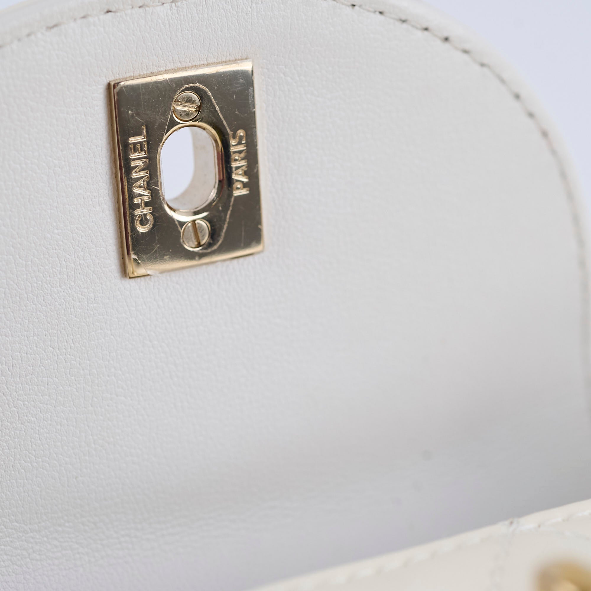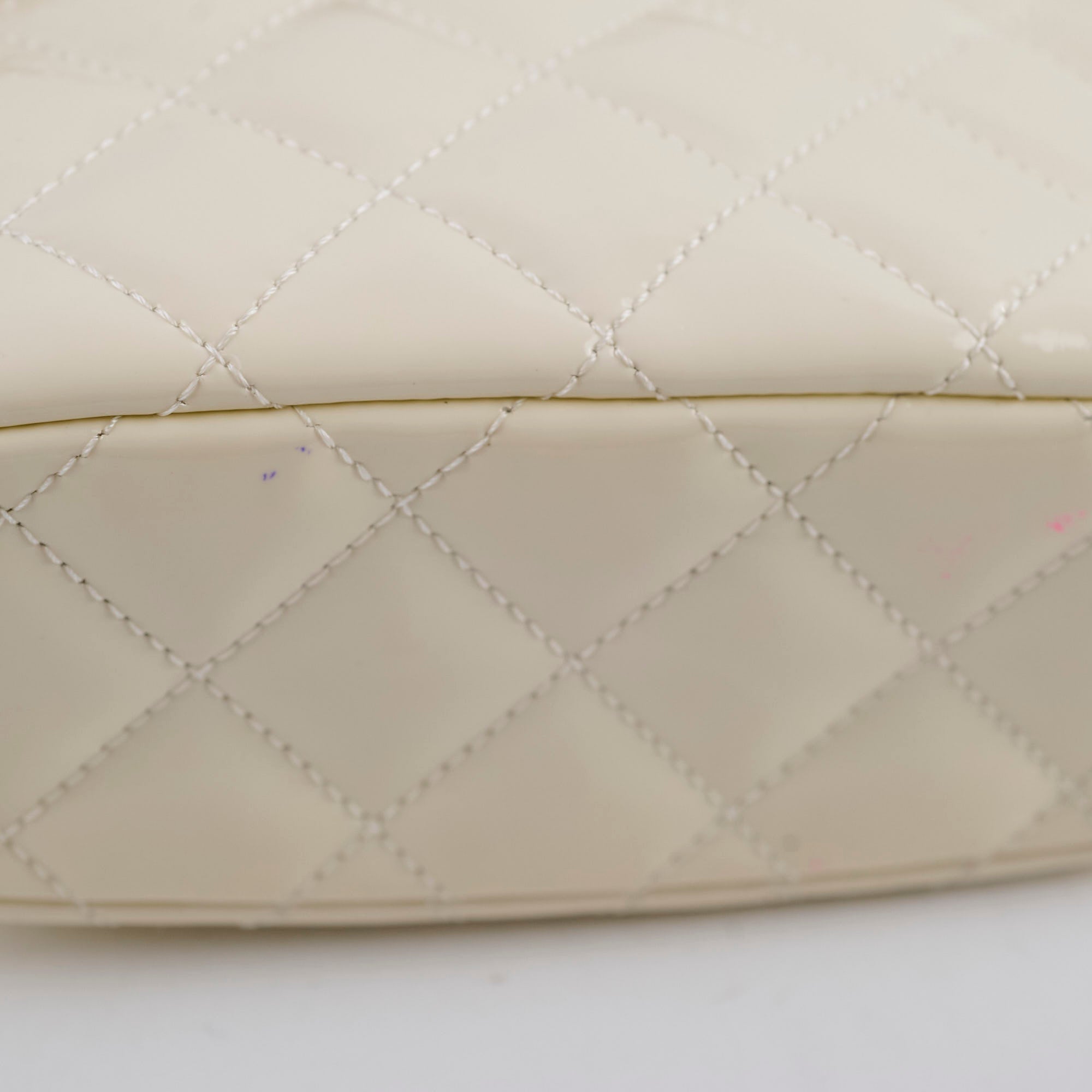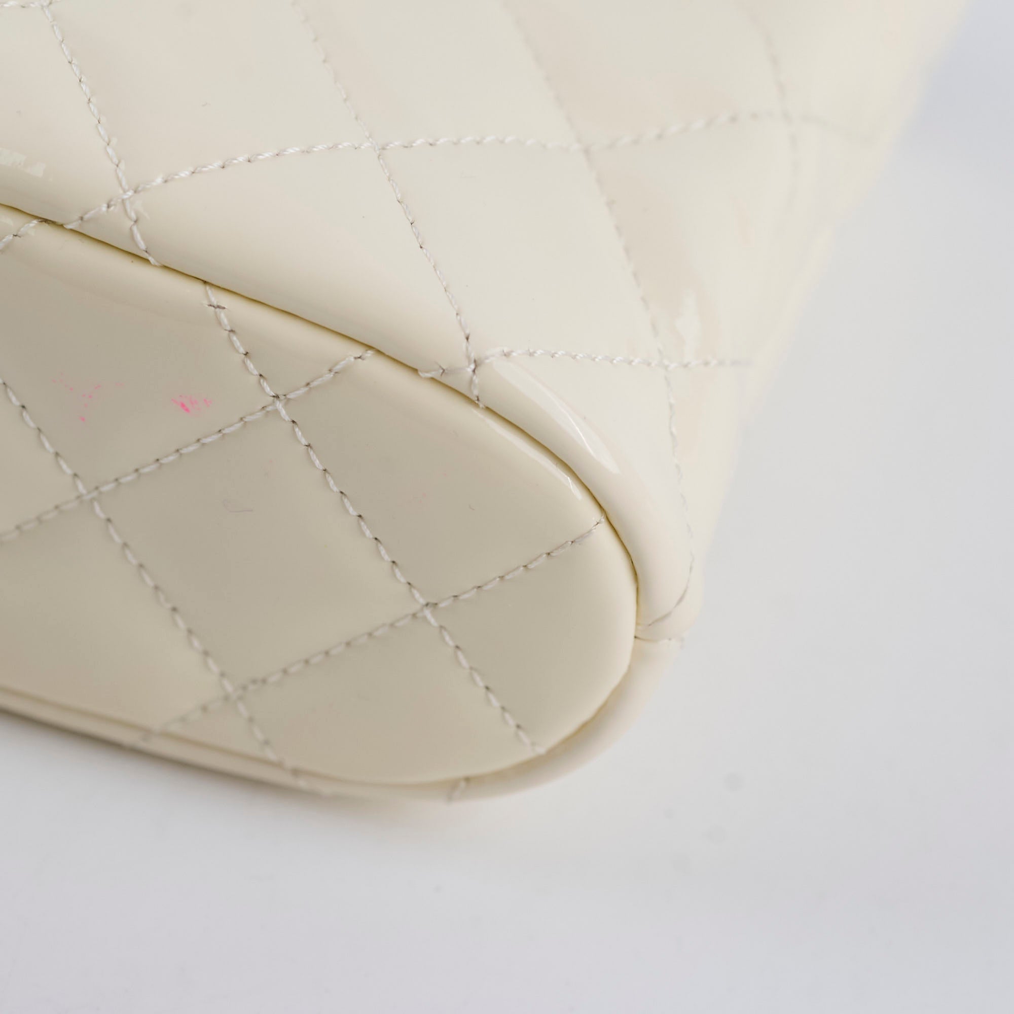 Pen marks at the bottom, stains on interior fabric, light scratches on hardware, one indent at the front leather