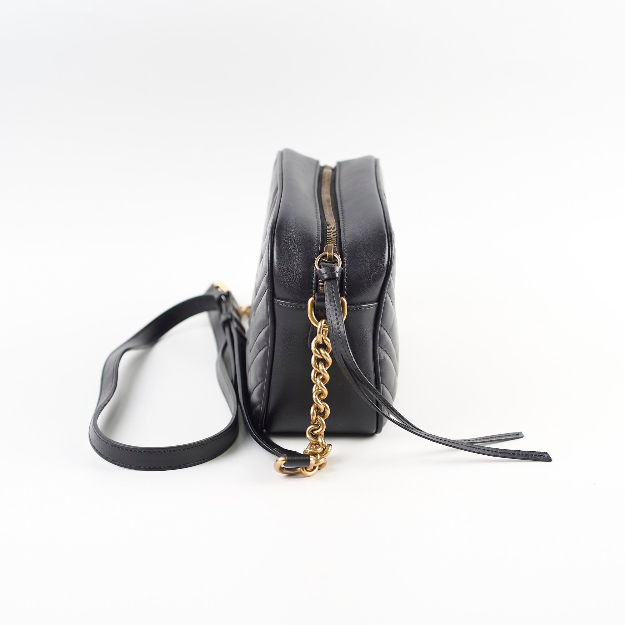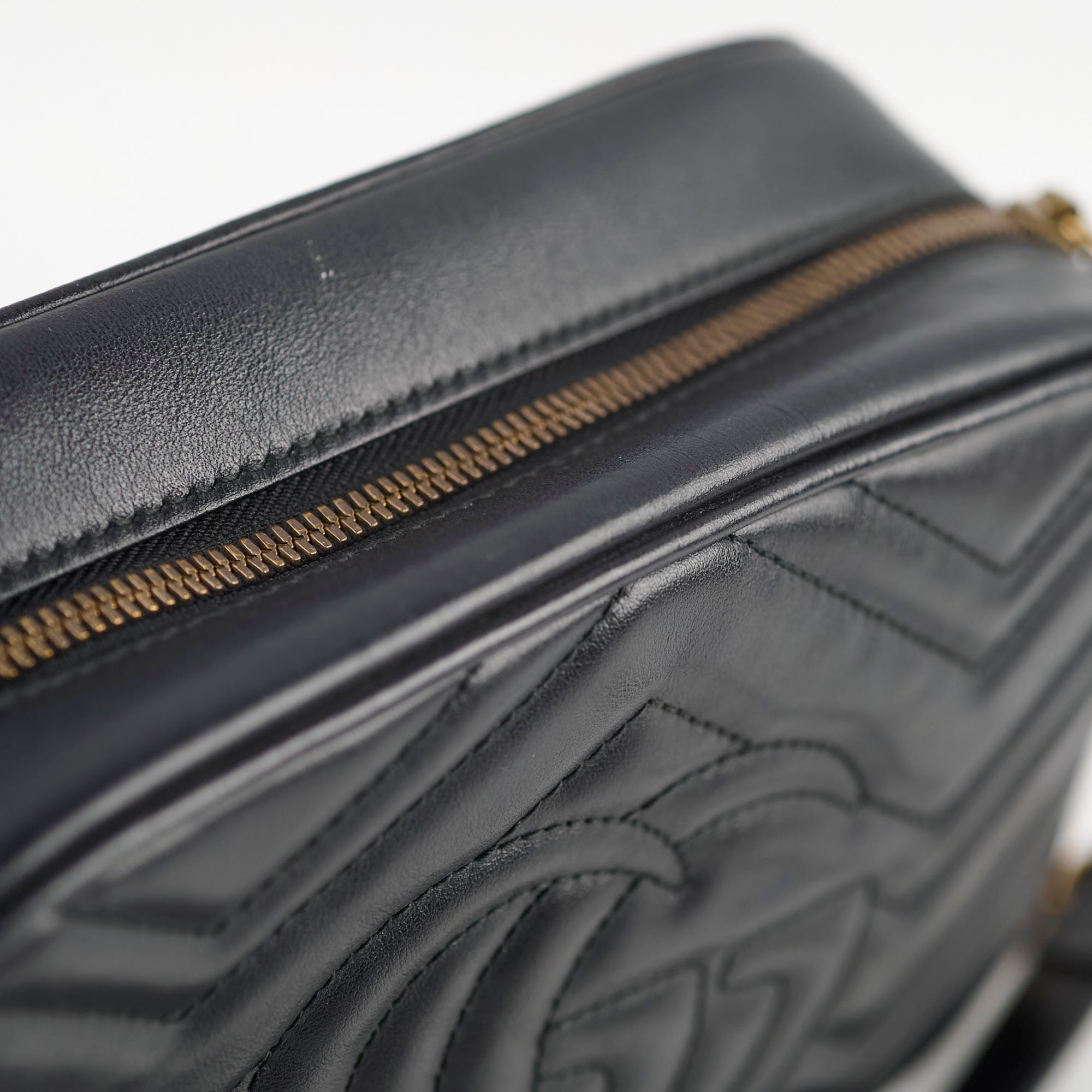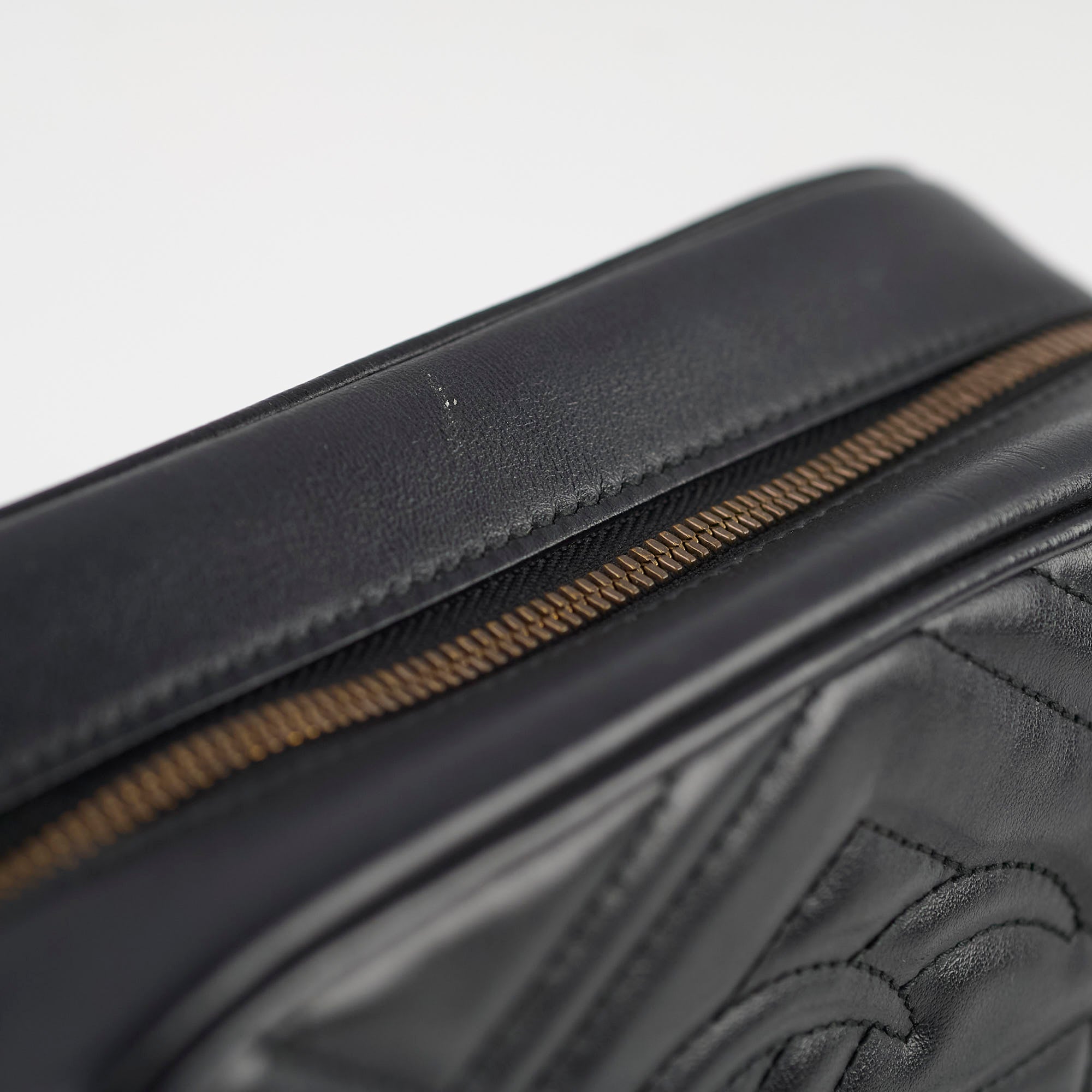 Tarnishing on hardware, hairline scratches on hardware, stain inside the pocket, rubbing on corners.