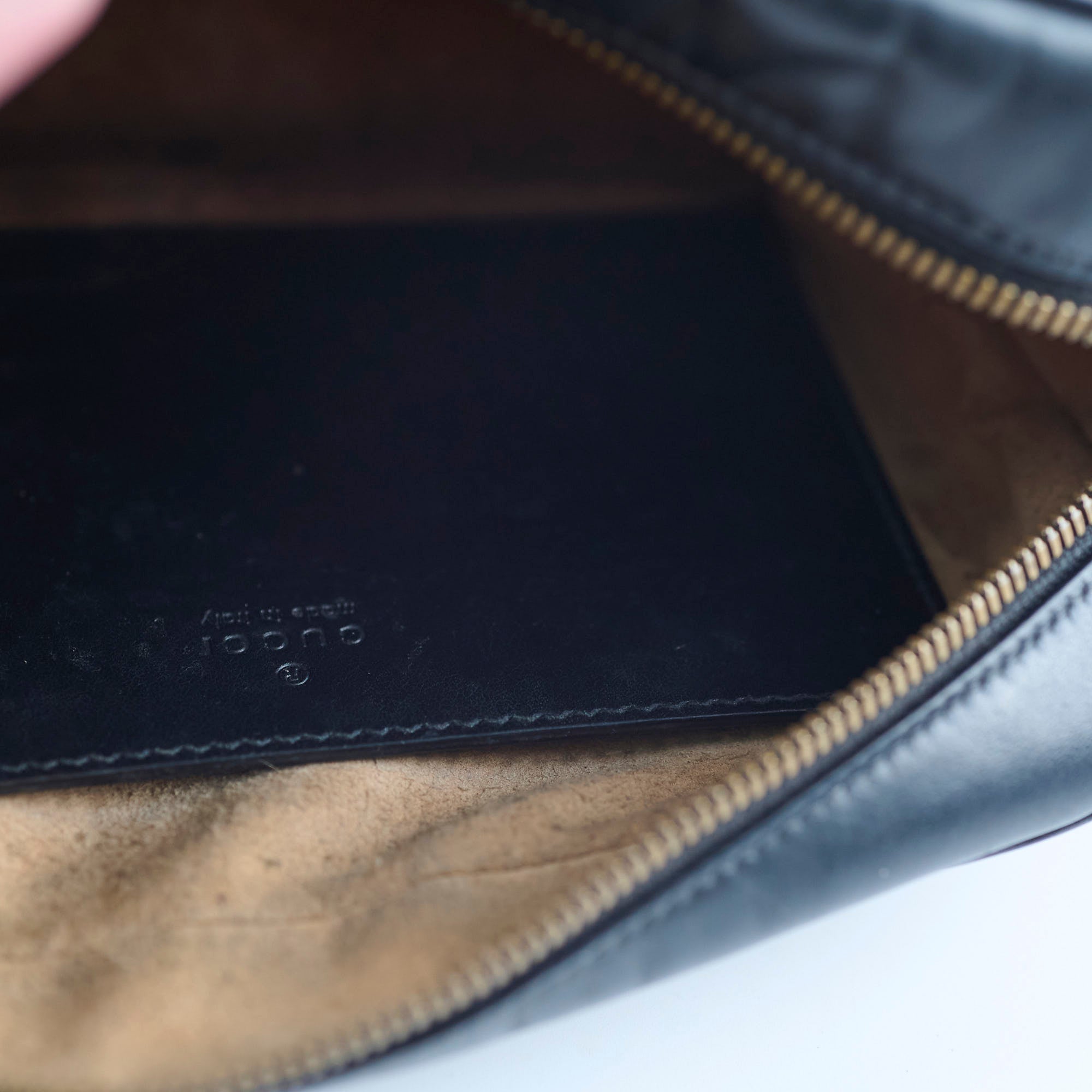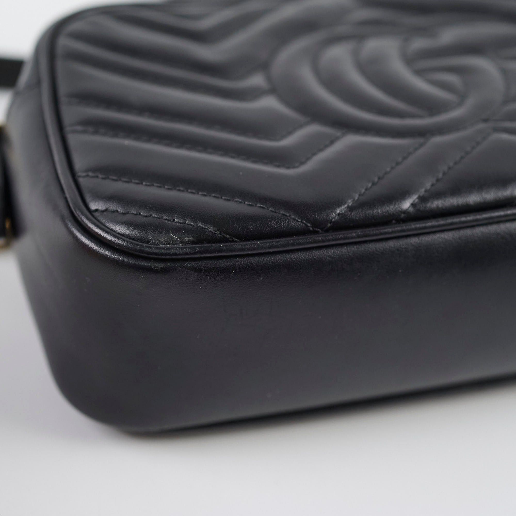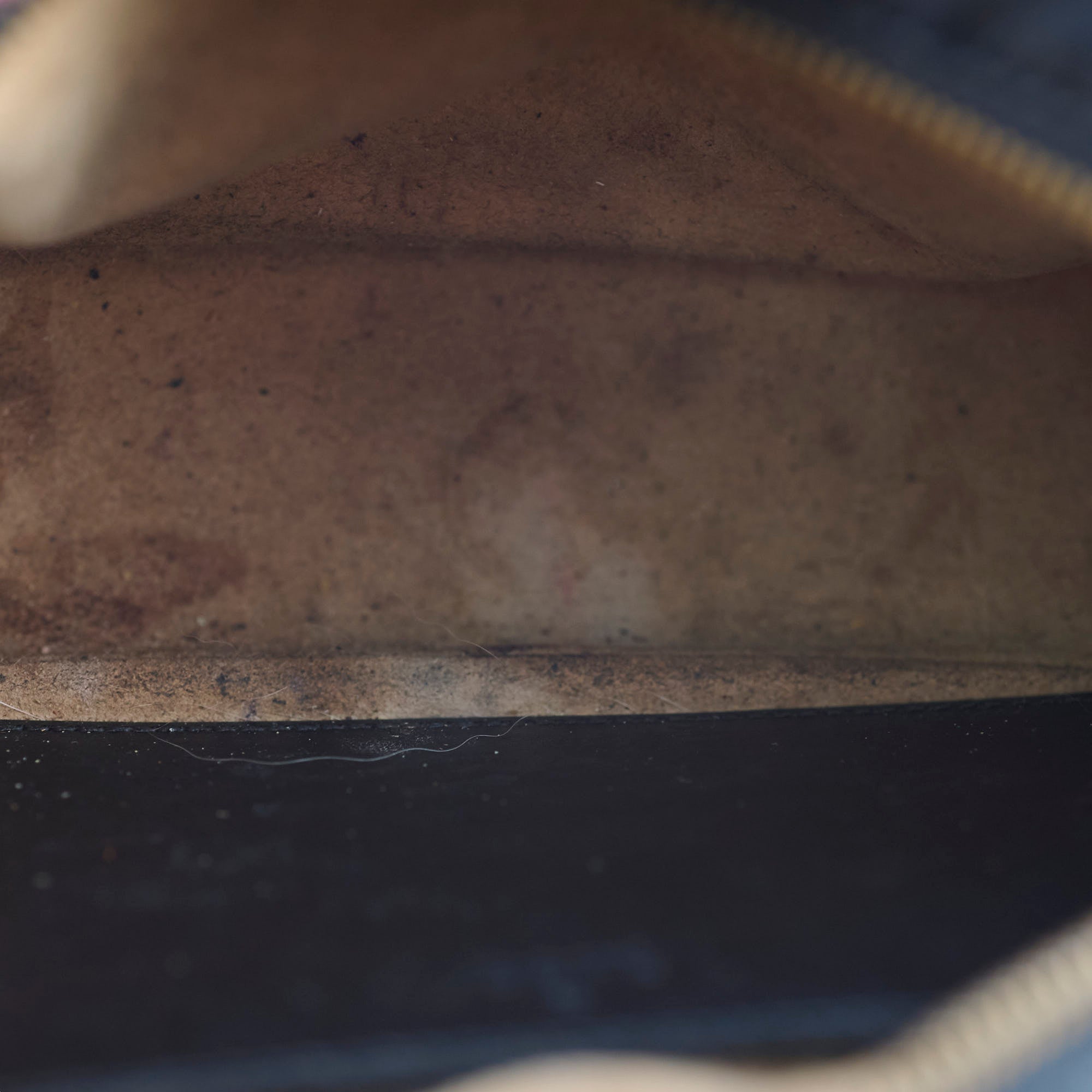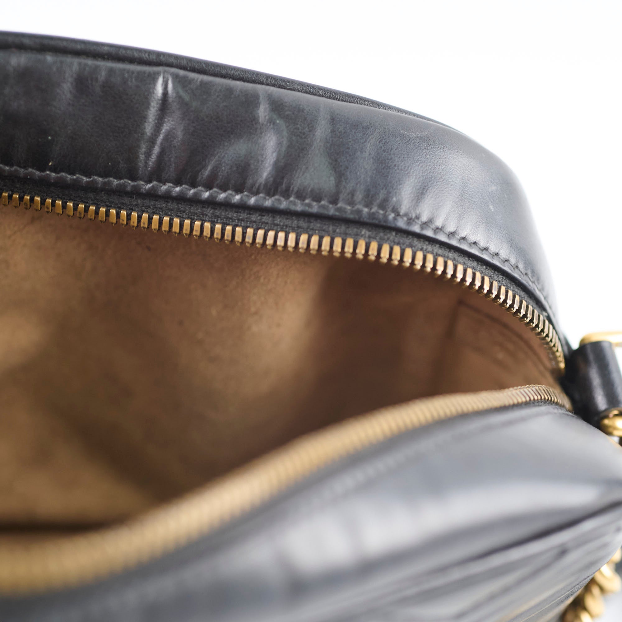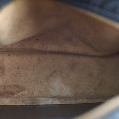 Rubbing on corners, scratches and tarnishing on hardware, indents on leather, peeling and stains on interior, stains on strap