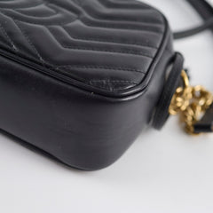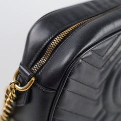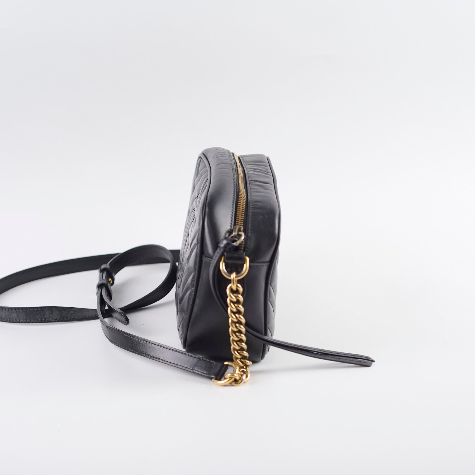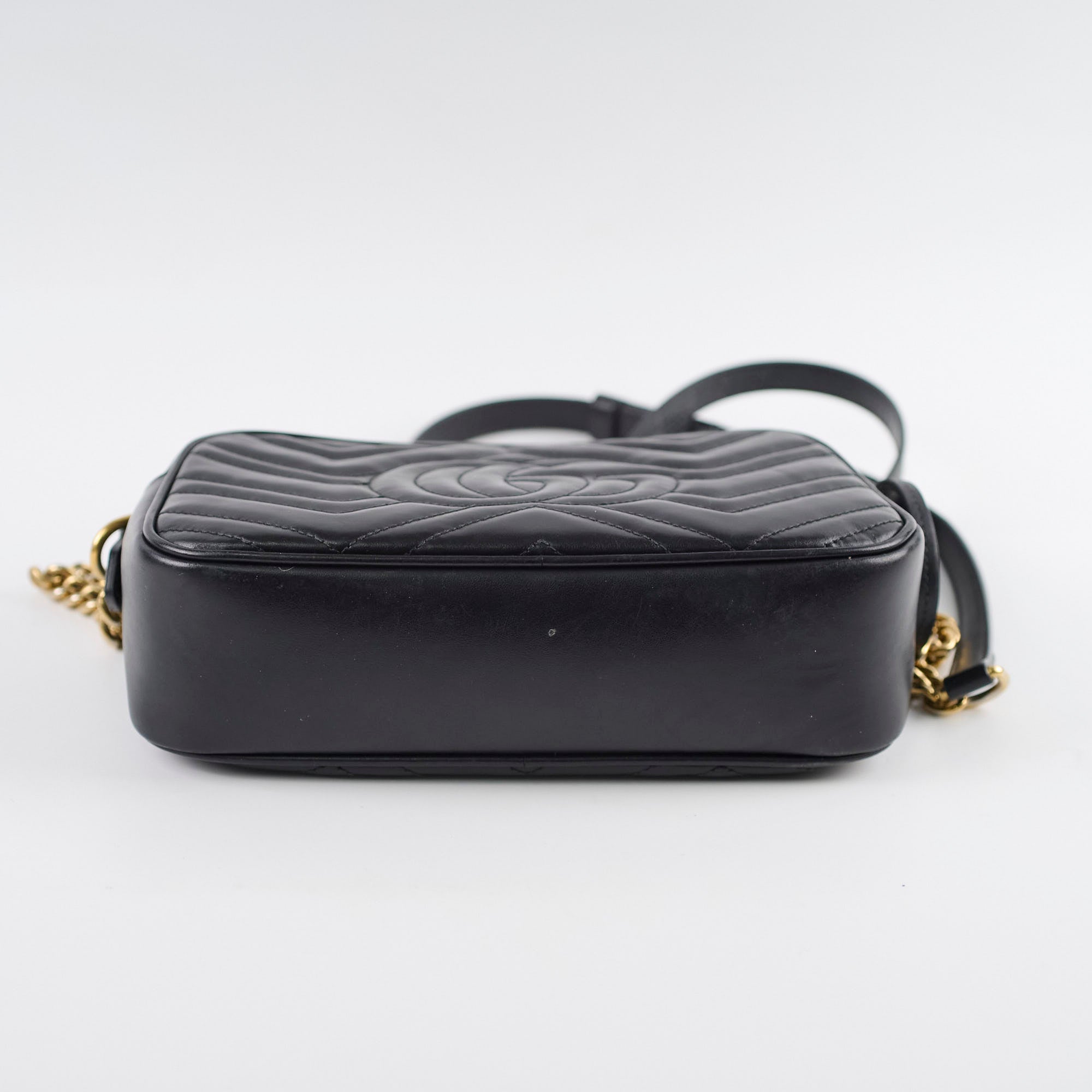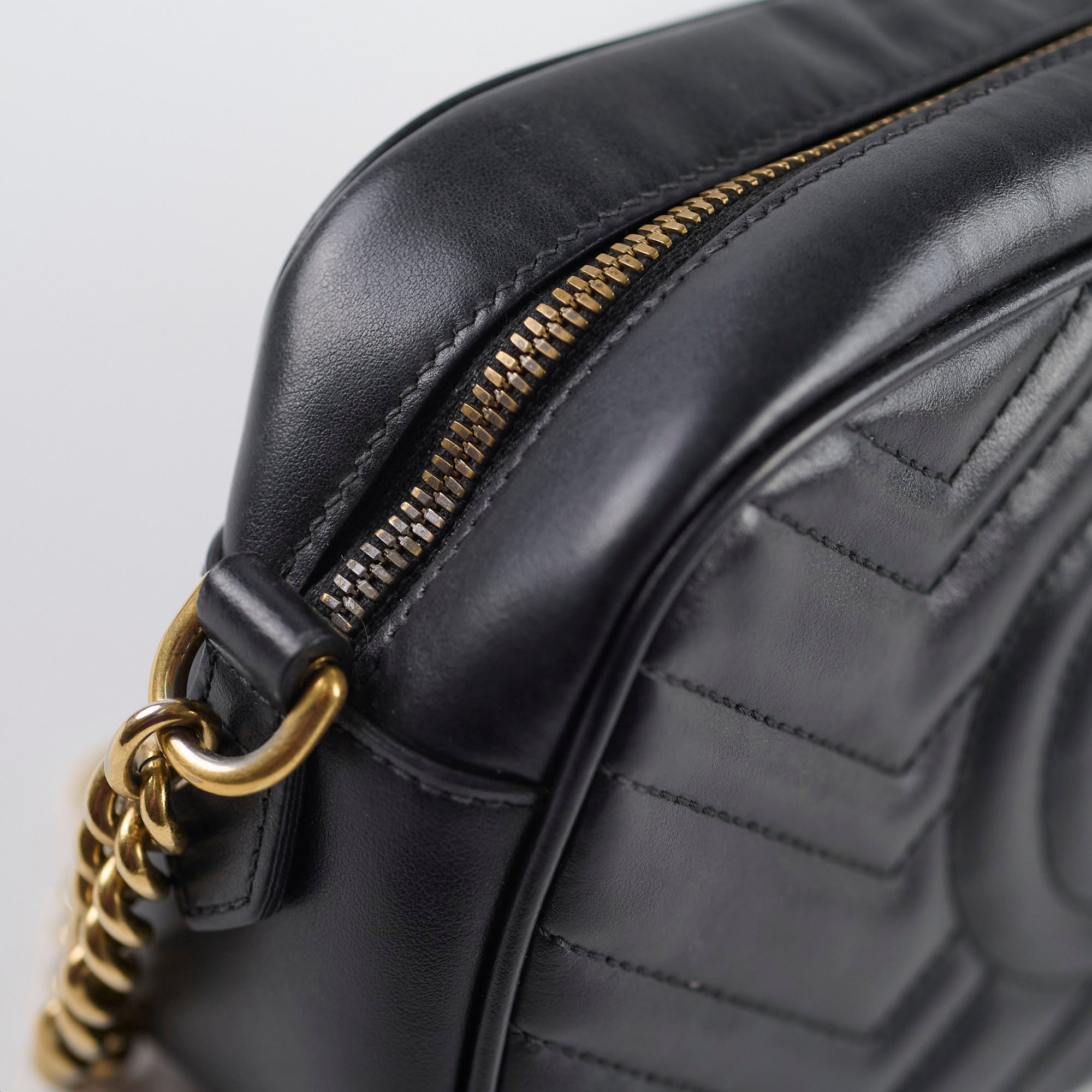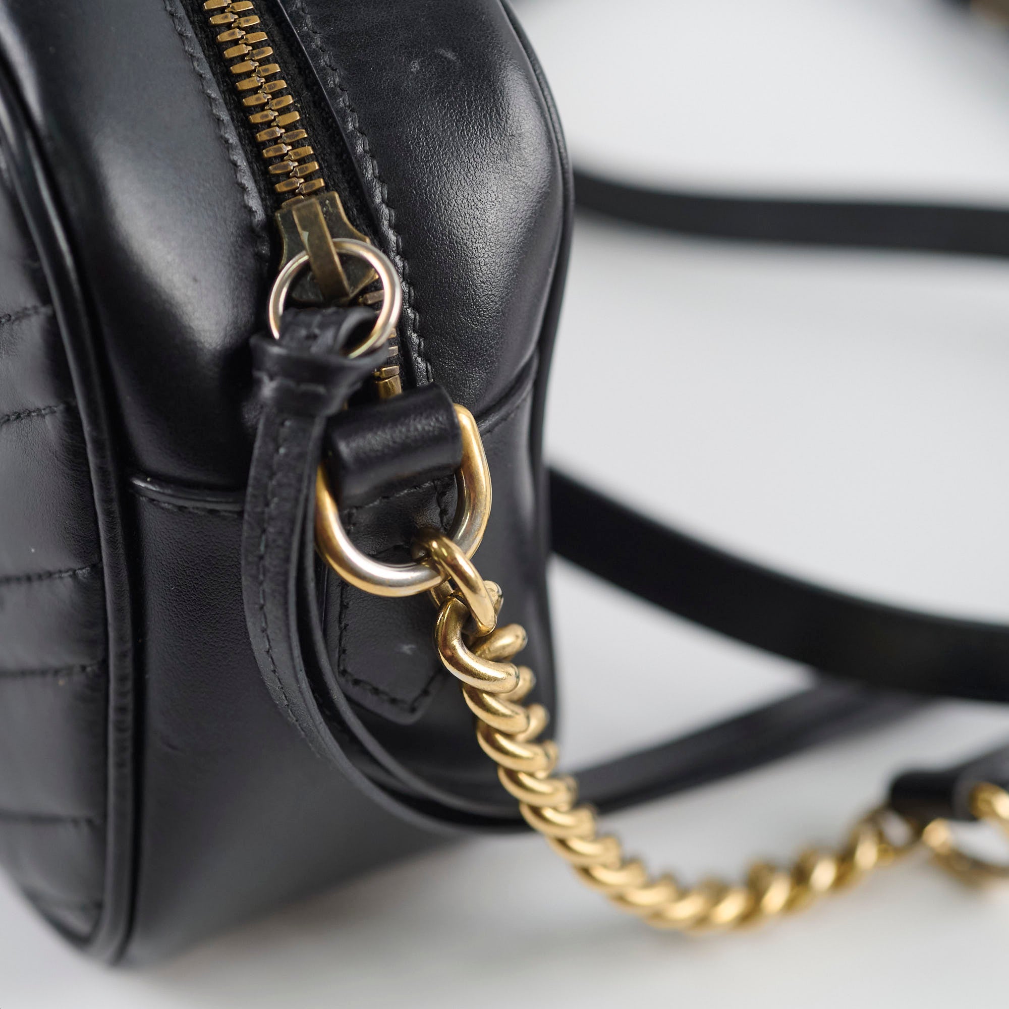 Rubbing on corners, scratches and tarnishing on hardware, indents on leather, peeling and stains on interior, stains on strap
