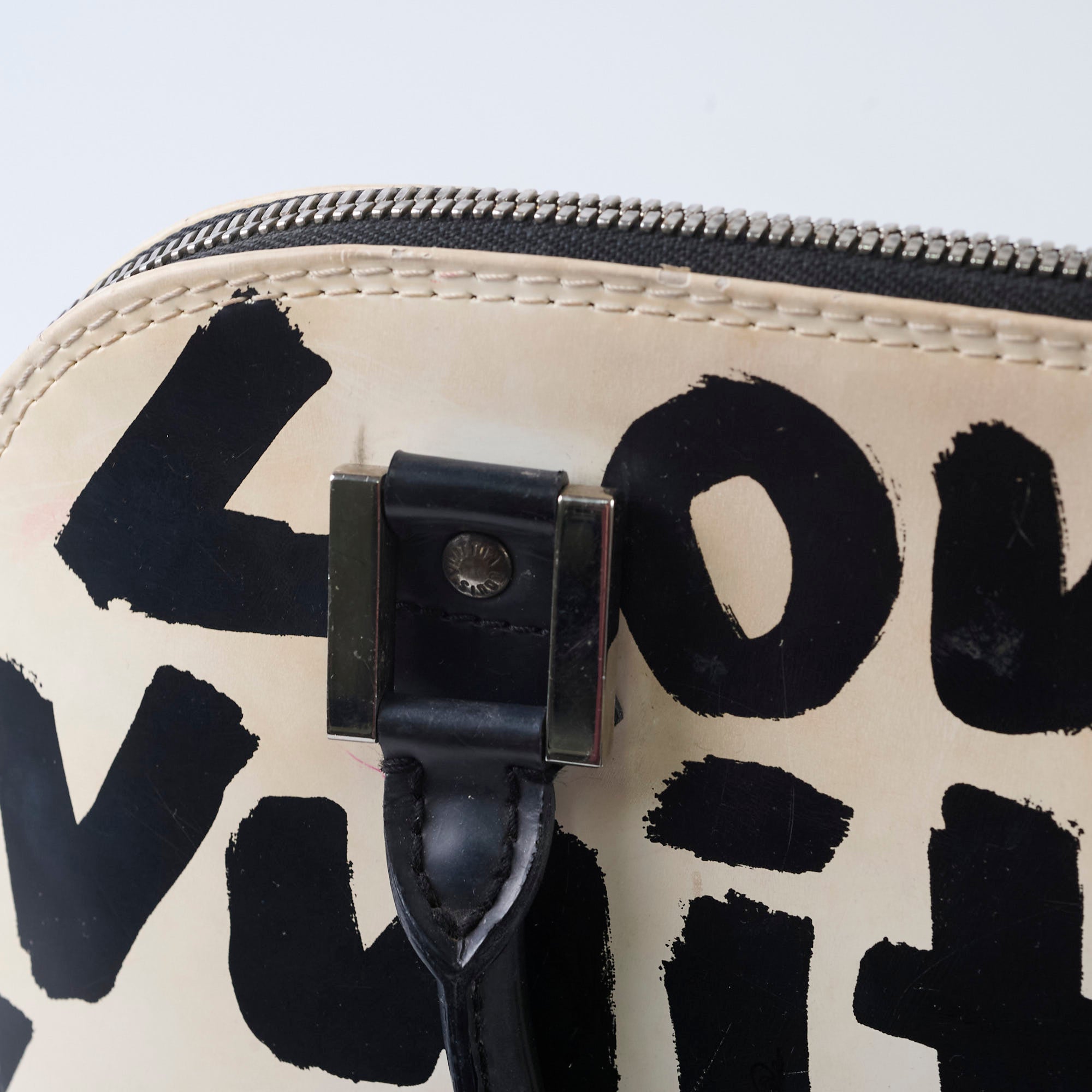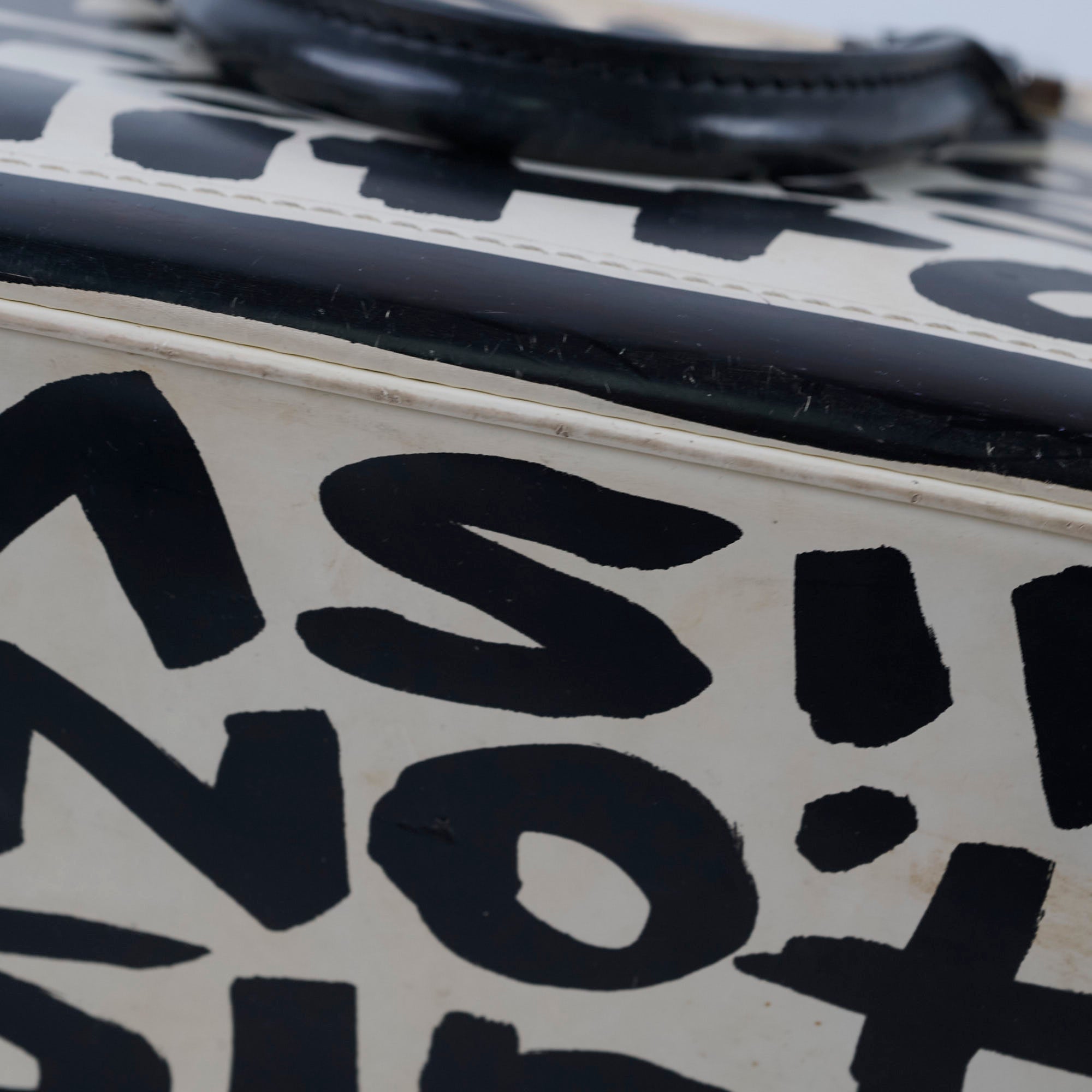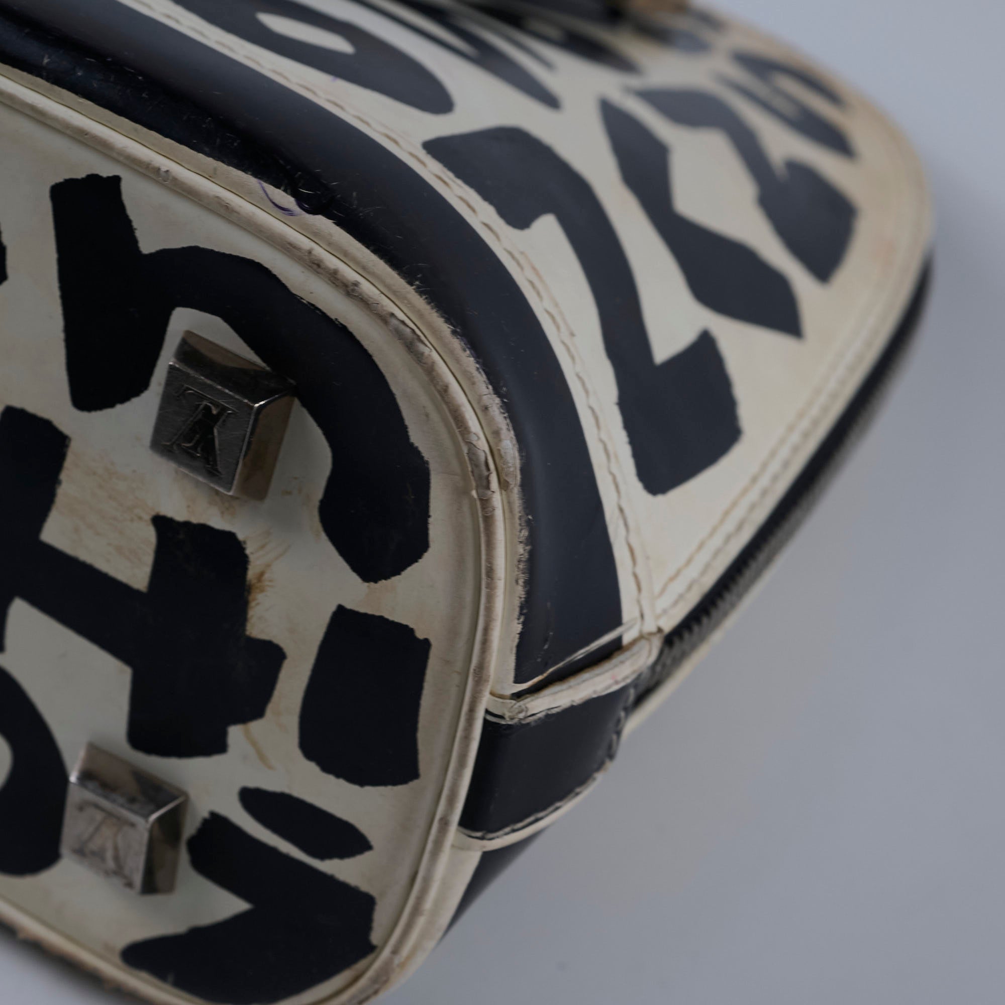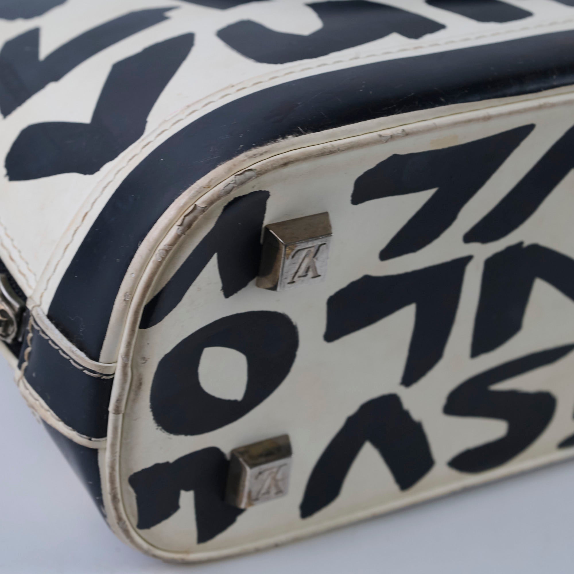 Rubbing and peeling on corners and edges, discoloration on leather, signs of wear on handles, stains on interior