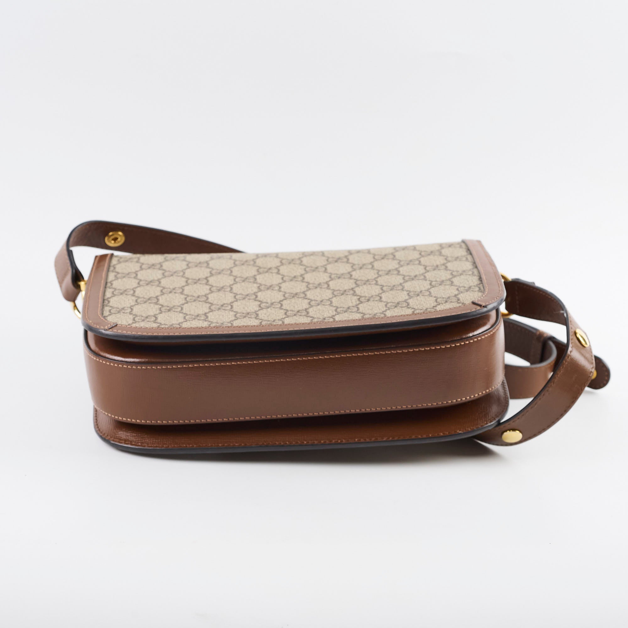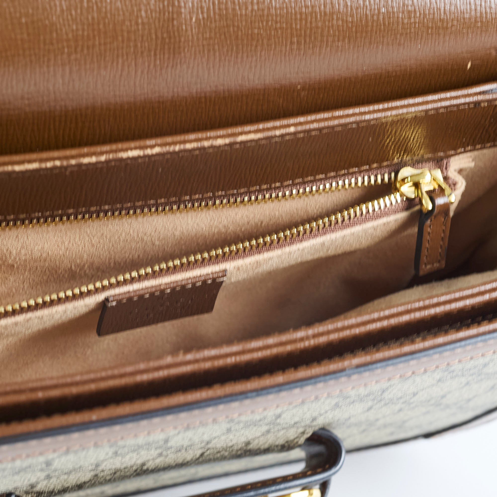 Minor scuffs on front flap and interior, small pen parks interior, peeling on glazing near d-ring on strap, clean inside and out