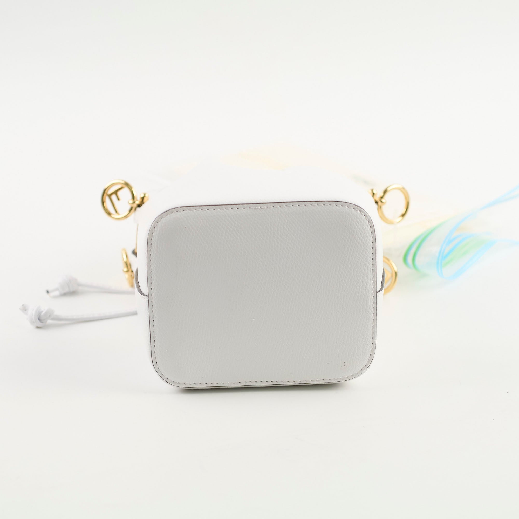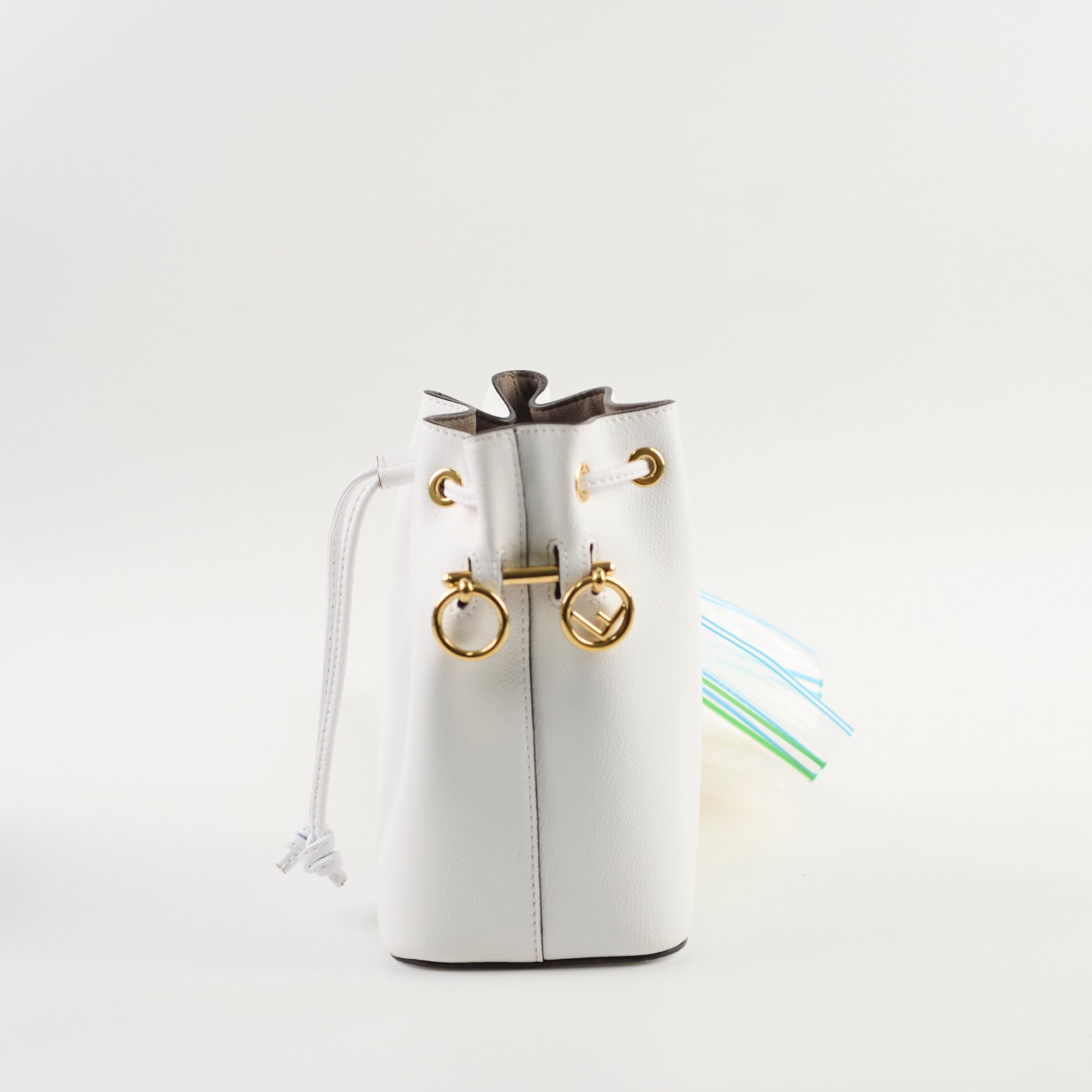 Light darkening on leather around the hardware (unavoidable), small glue mark near the drawstring and on the back, leather in excellent condition