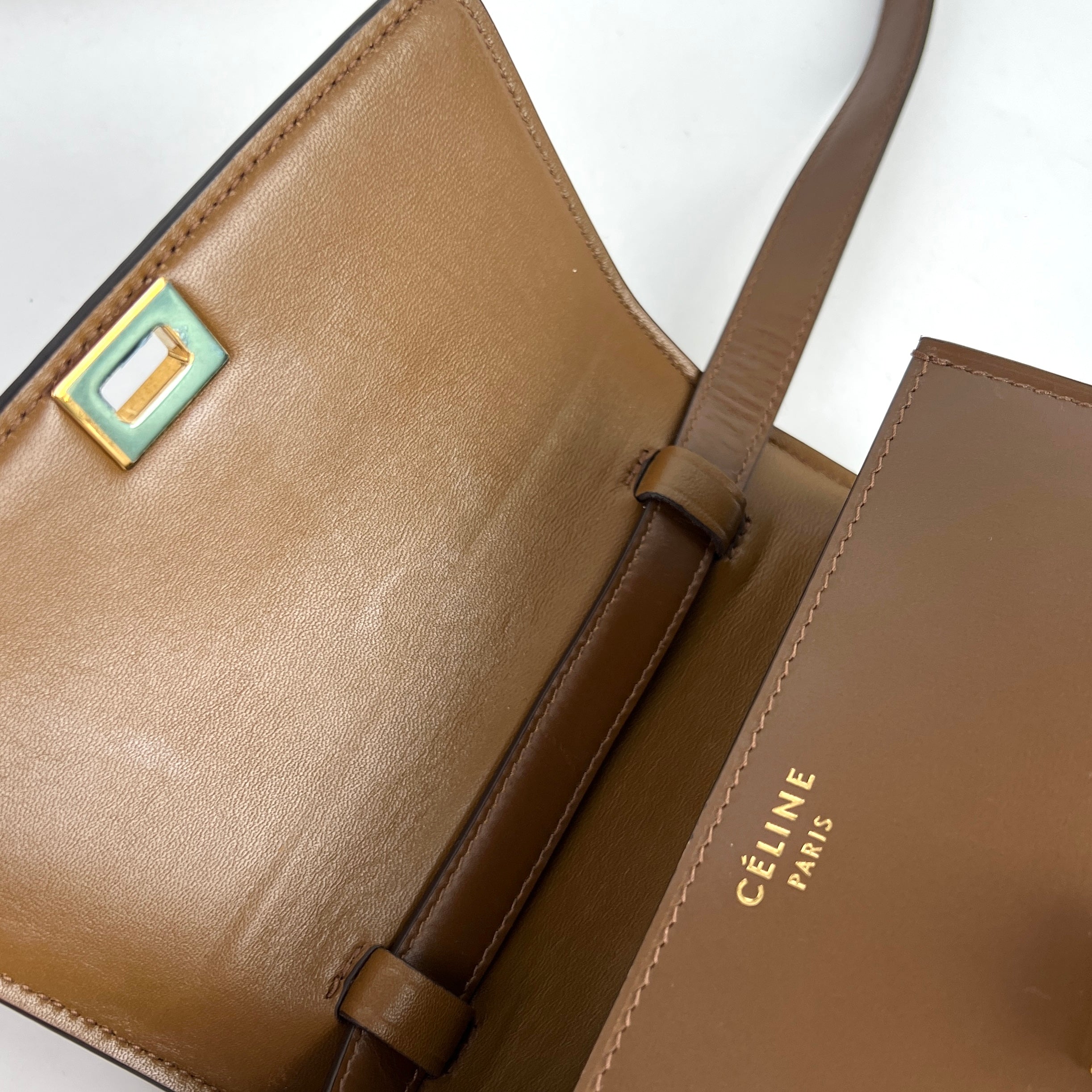 Some marks on flap, some light scratches on leather, structure is great