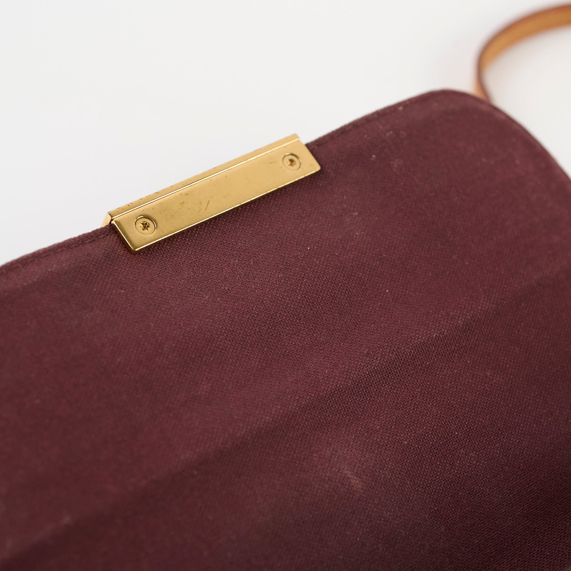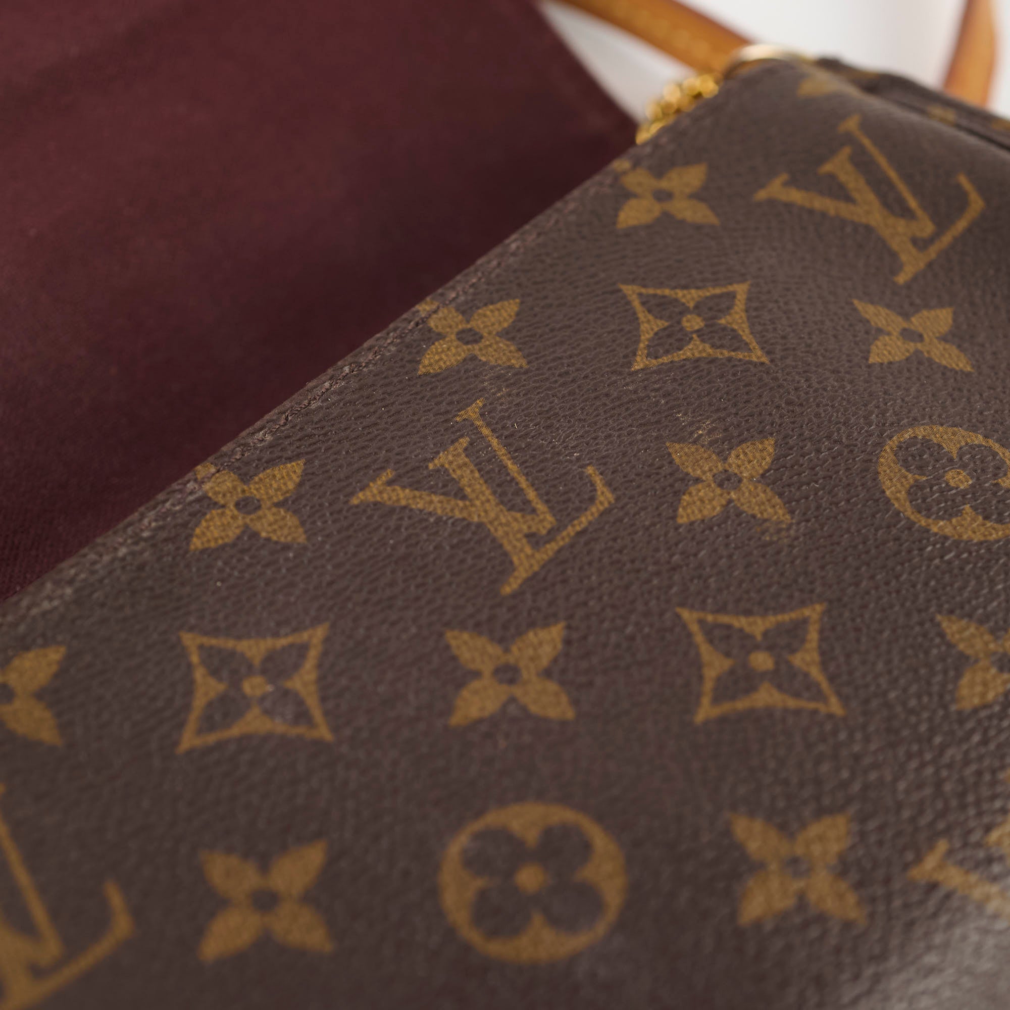 Scratches & tarnishing on hardware, darkening on vachetta, minor stains interior, creasing on canvas on front flap