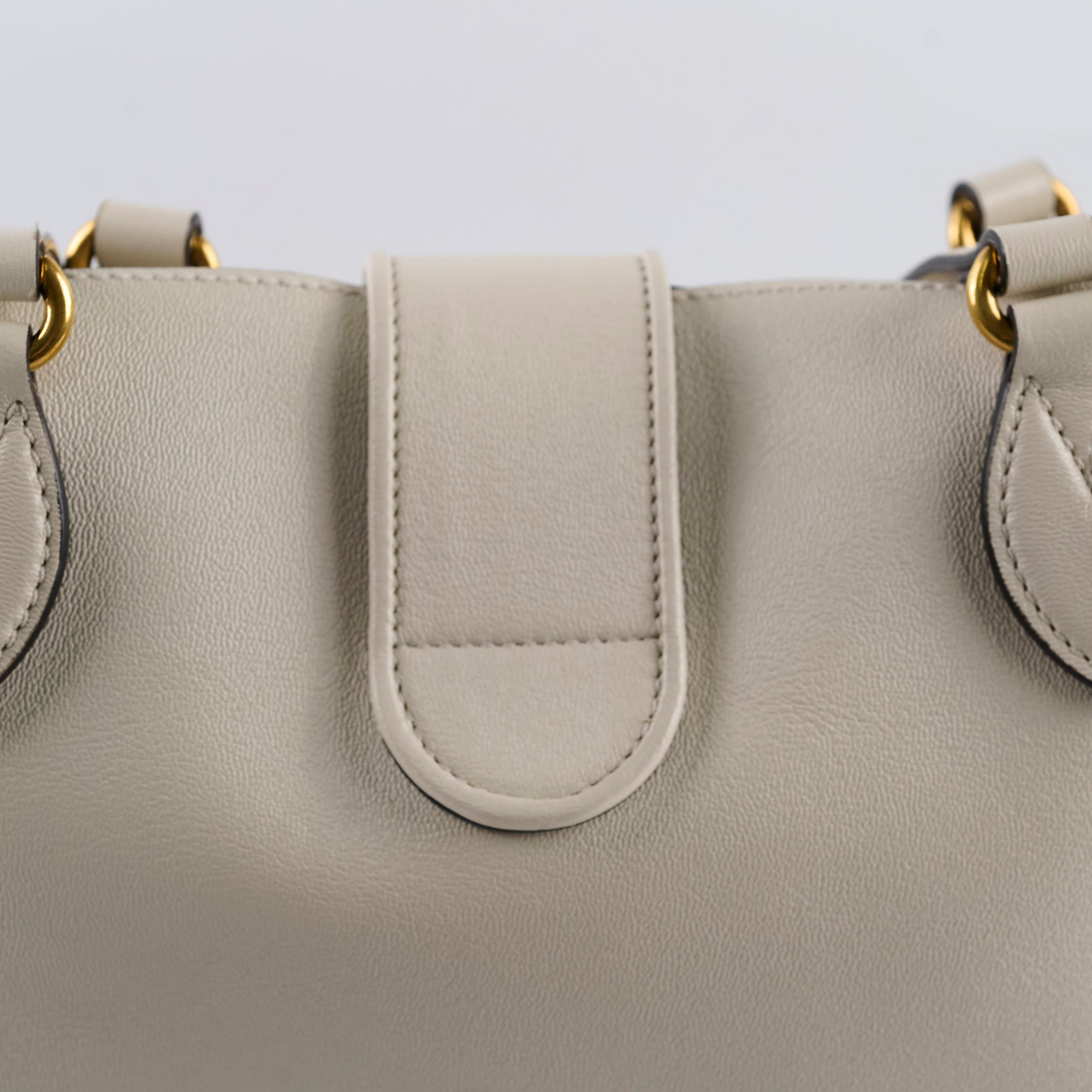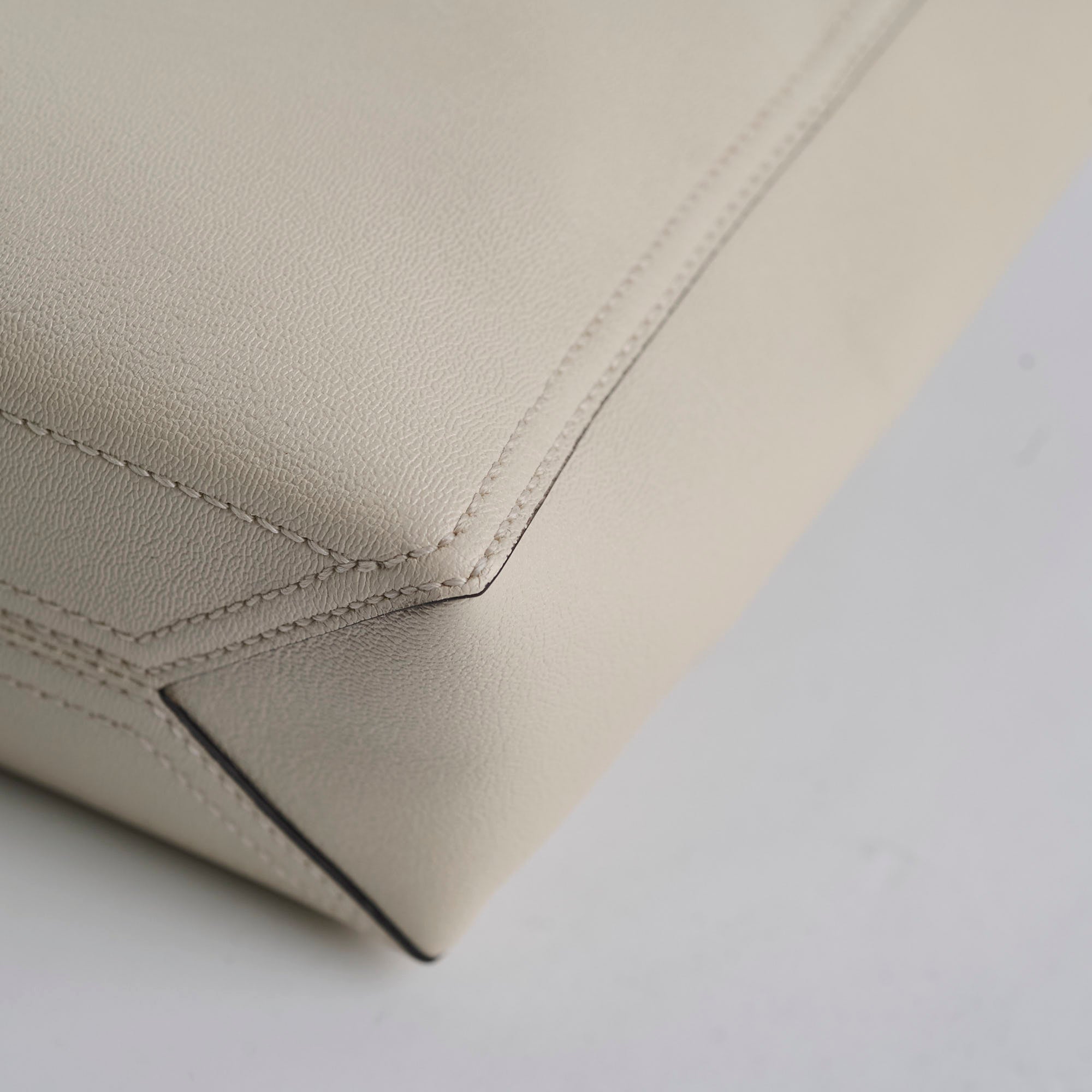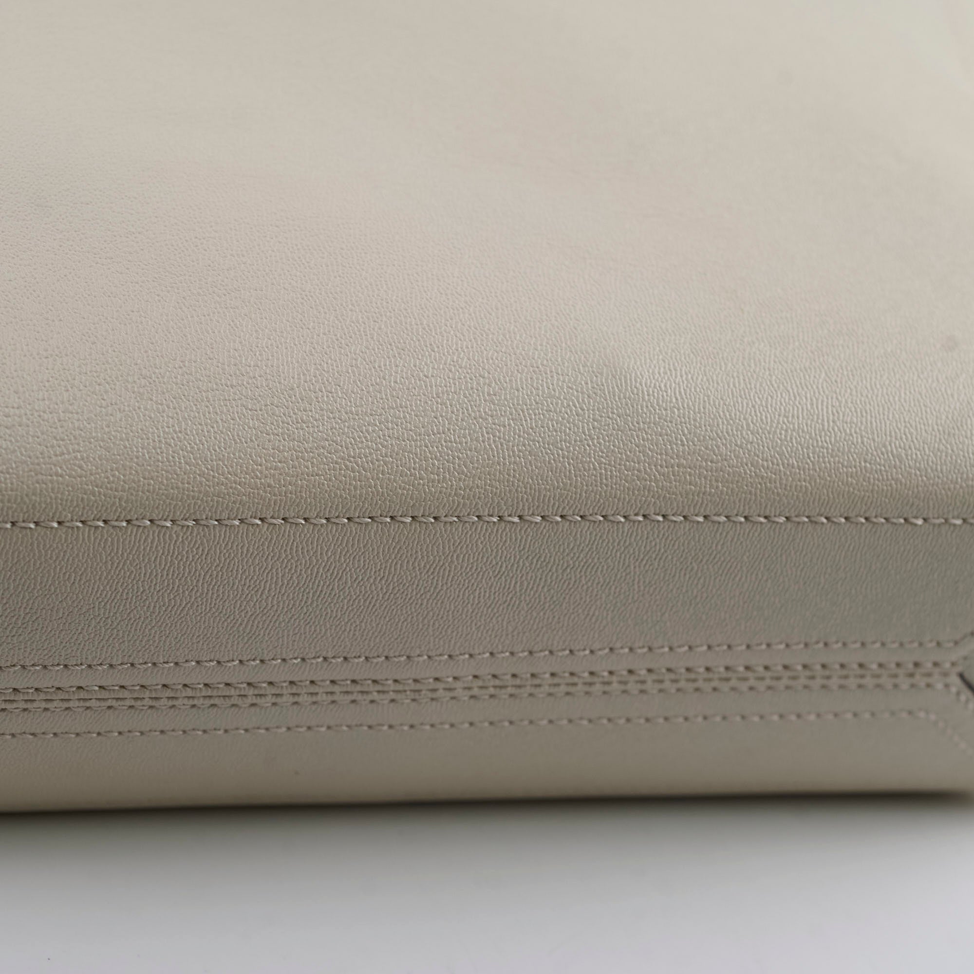 Structure slightly softened, scratches and tarnishing on hardware, clean inside and out, two tiny dots at front leather