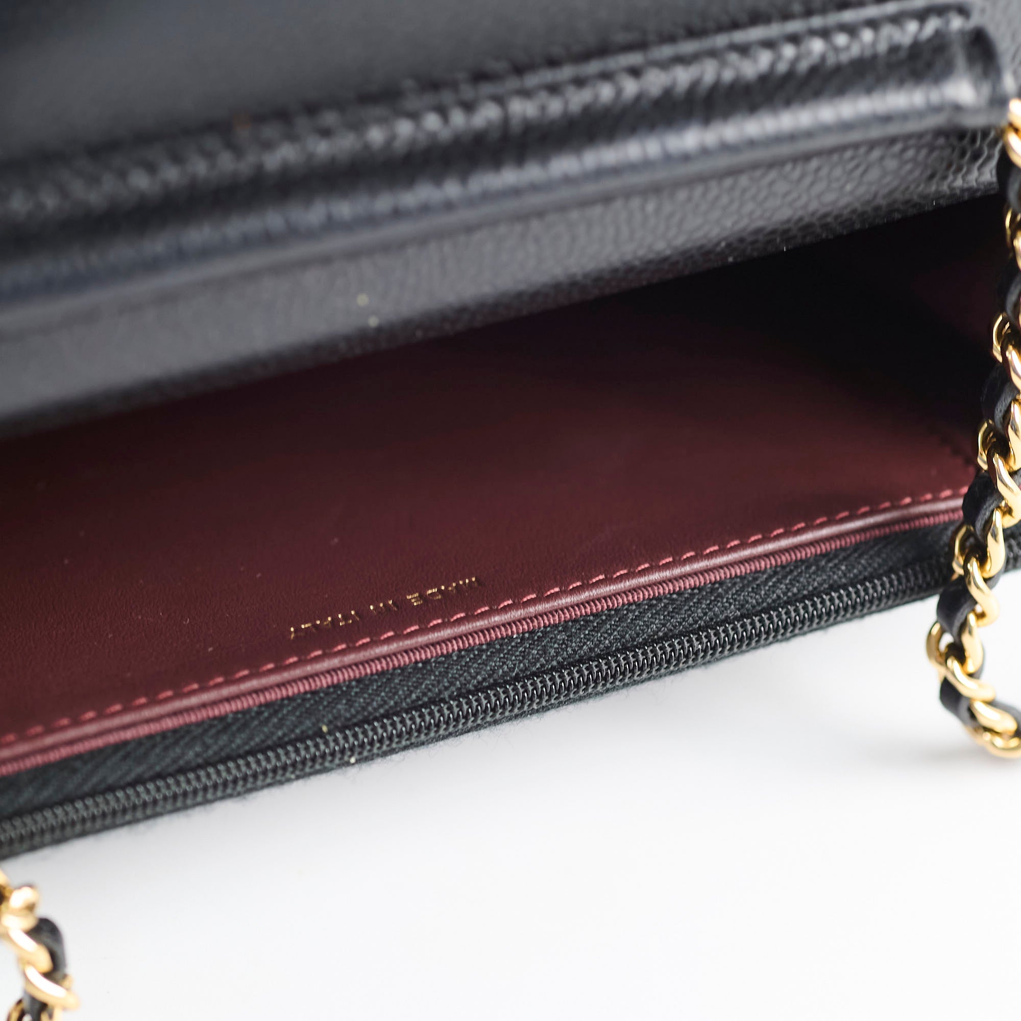 Light hairline scratches on hardware, minor indent from zipper (unavoidable)