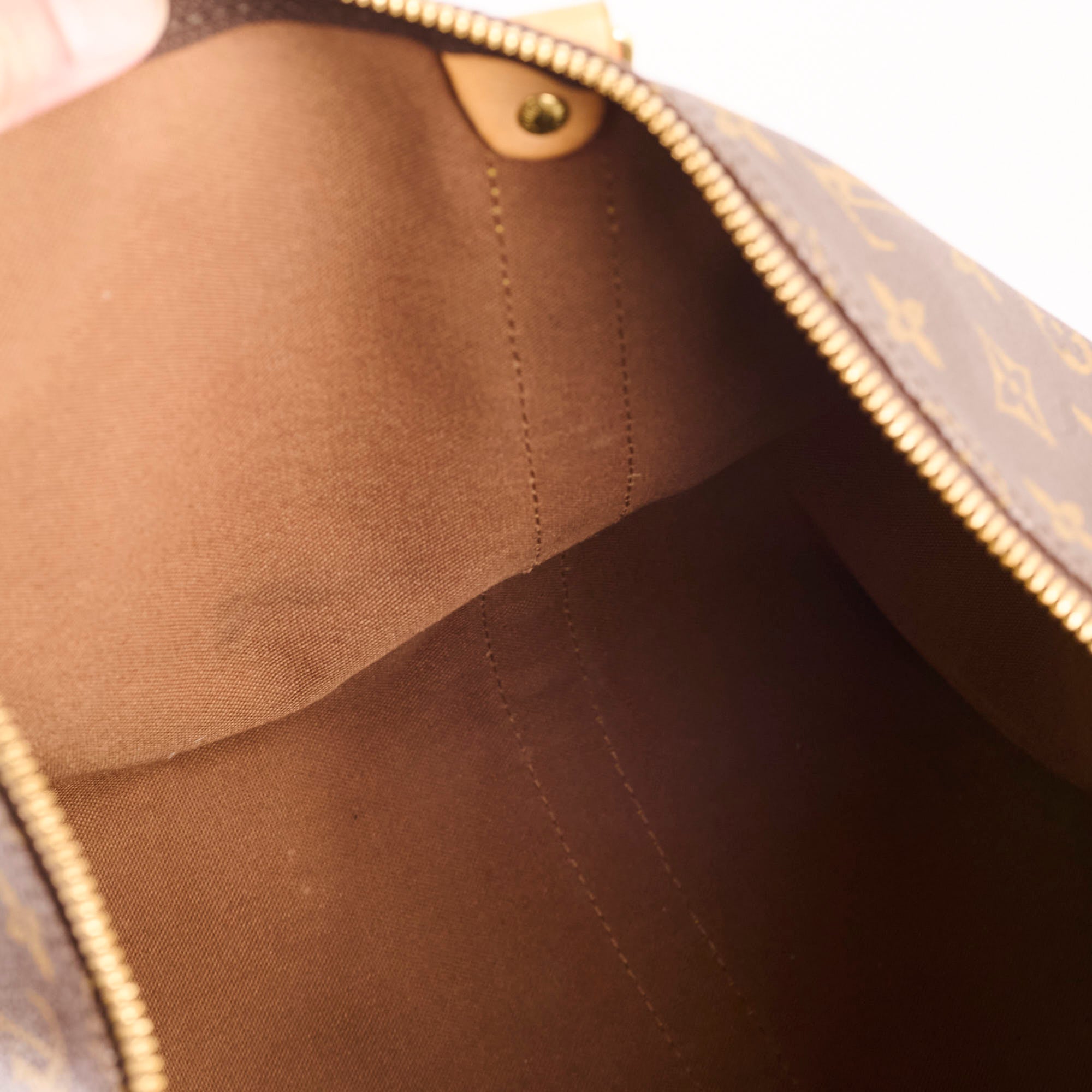 Watermarks on leather, scratch and tarnish on hardware, minor stains inside