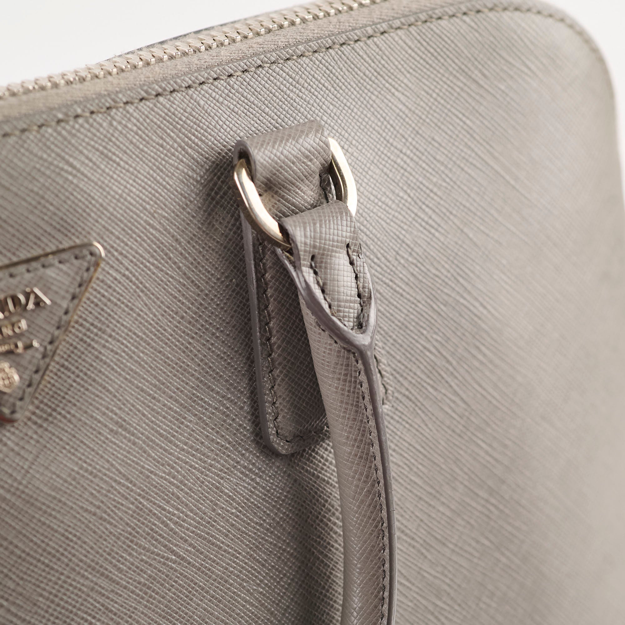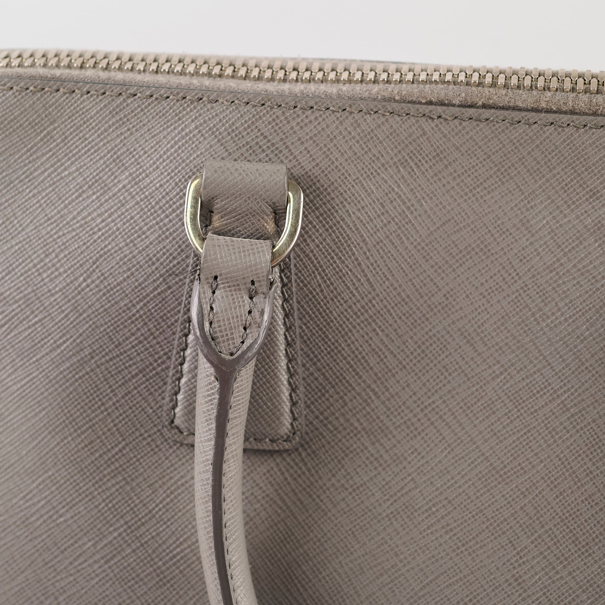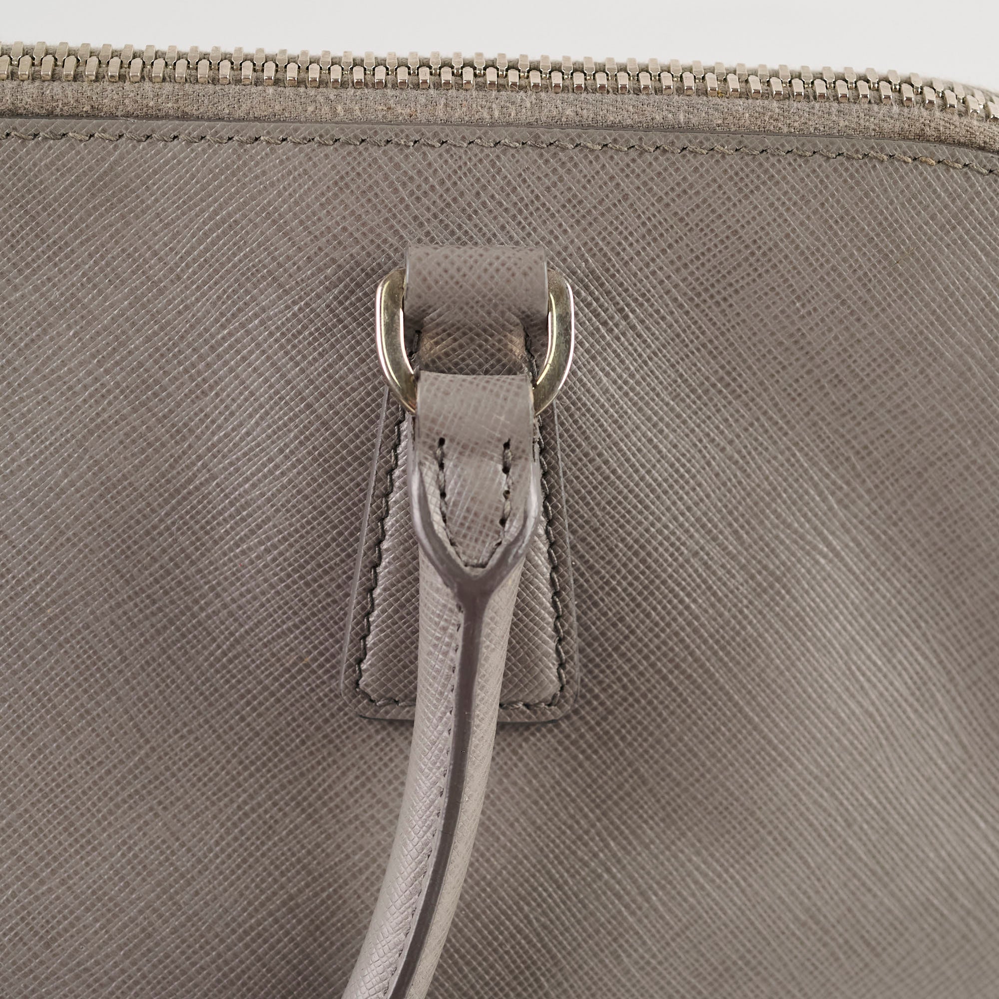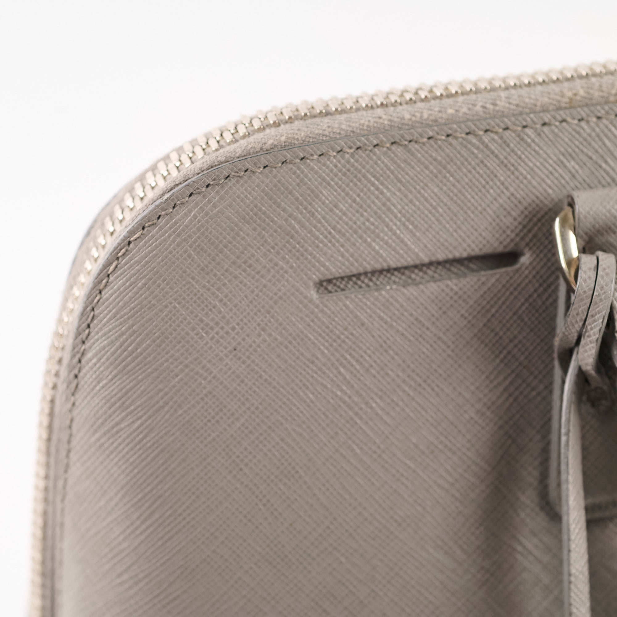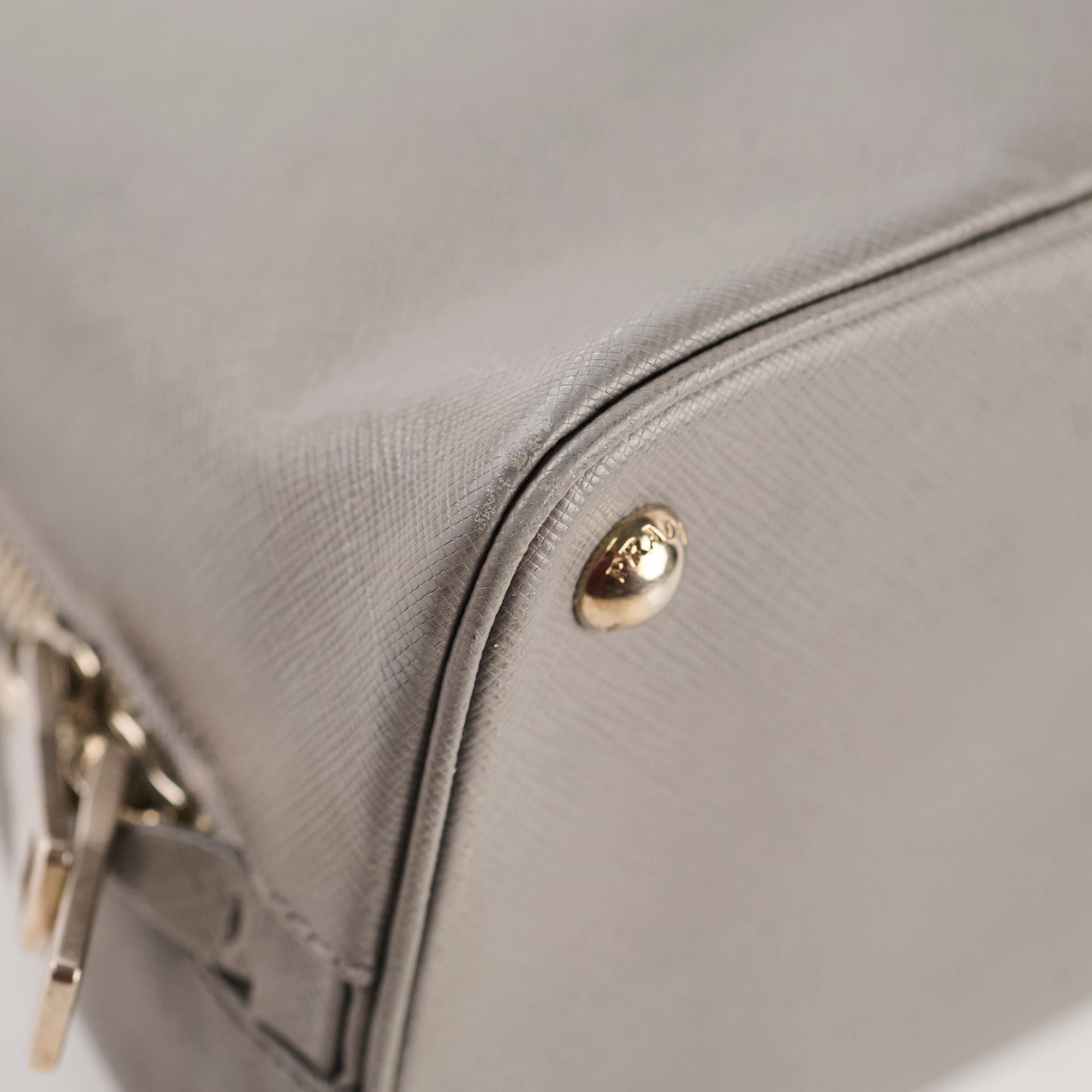 Slightly softened shape, rubbing on corners, small white mark near the zipper stop, slight tarnish on hardware