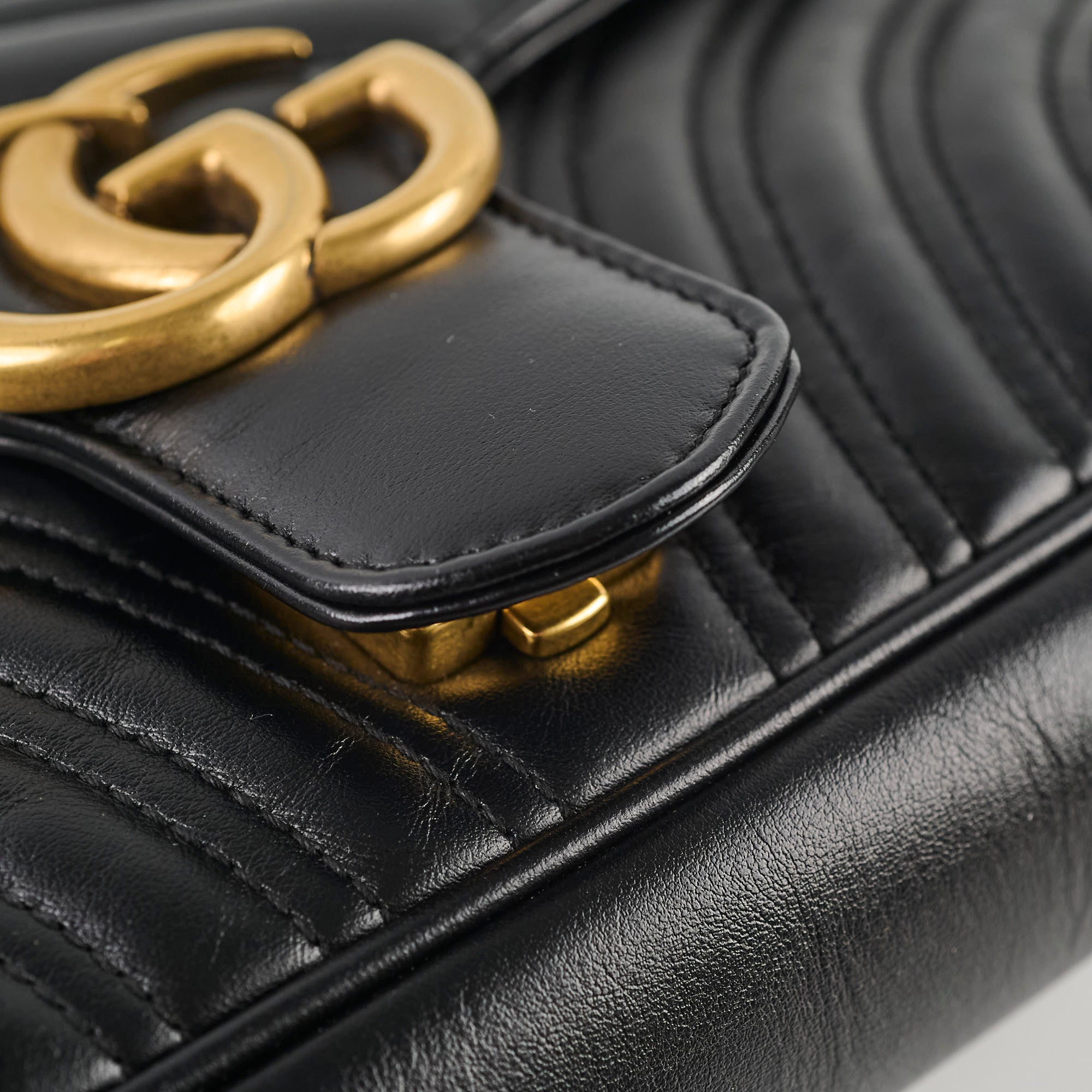 Scratches and tarnishing on hardware, softened structure, creasing on flap and interior leather