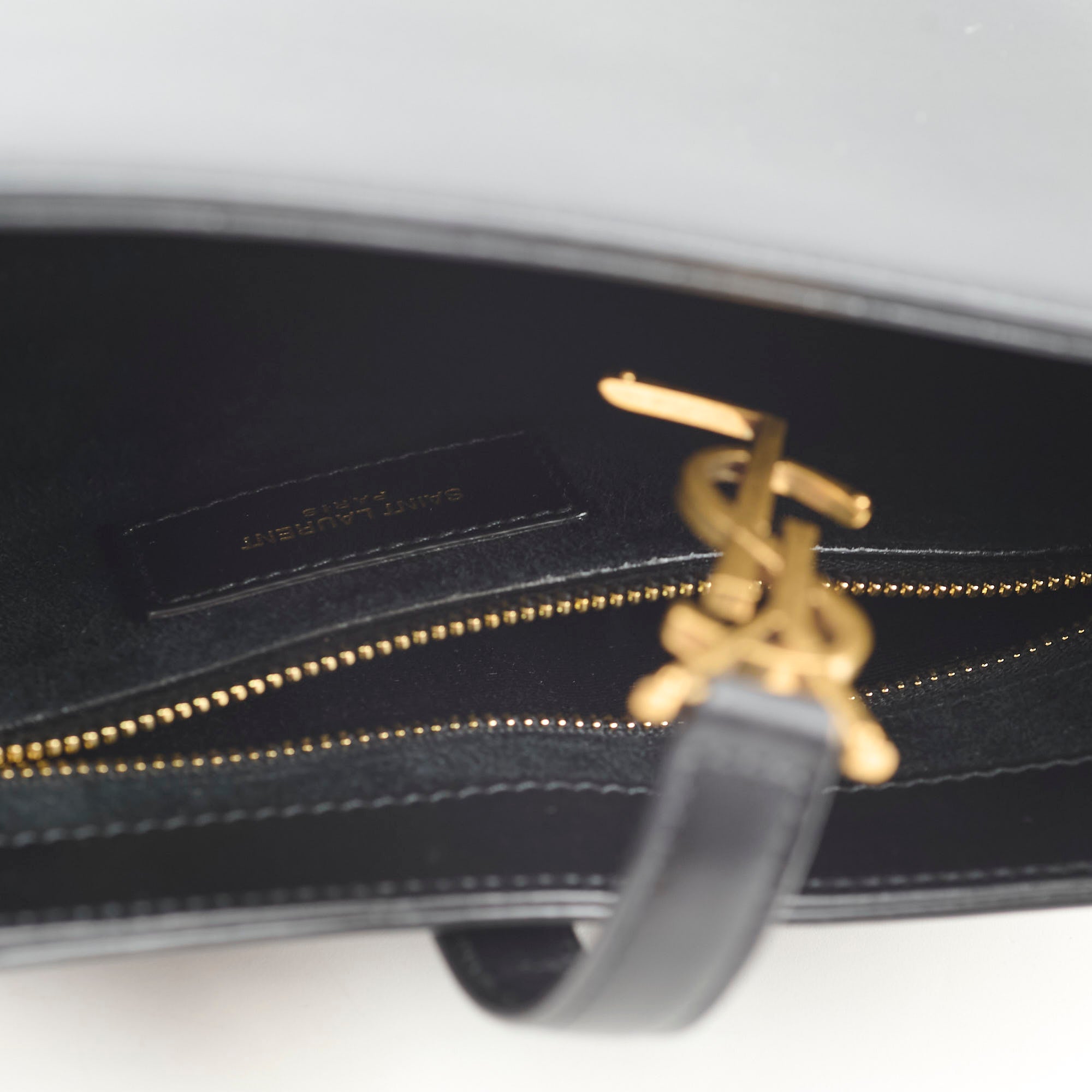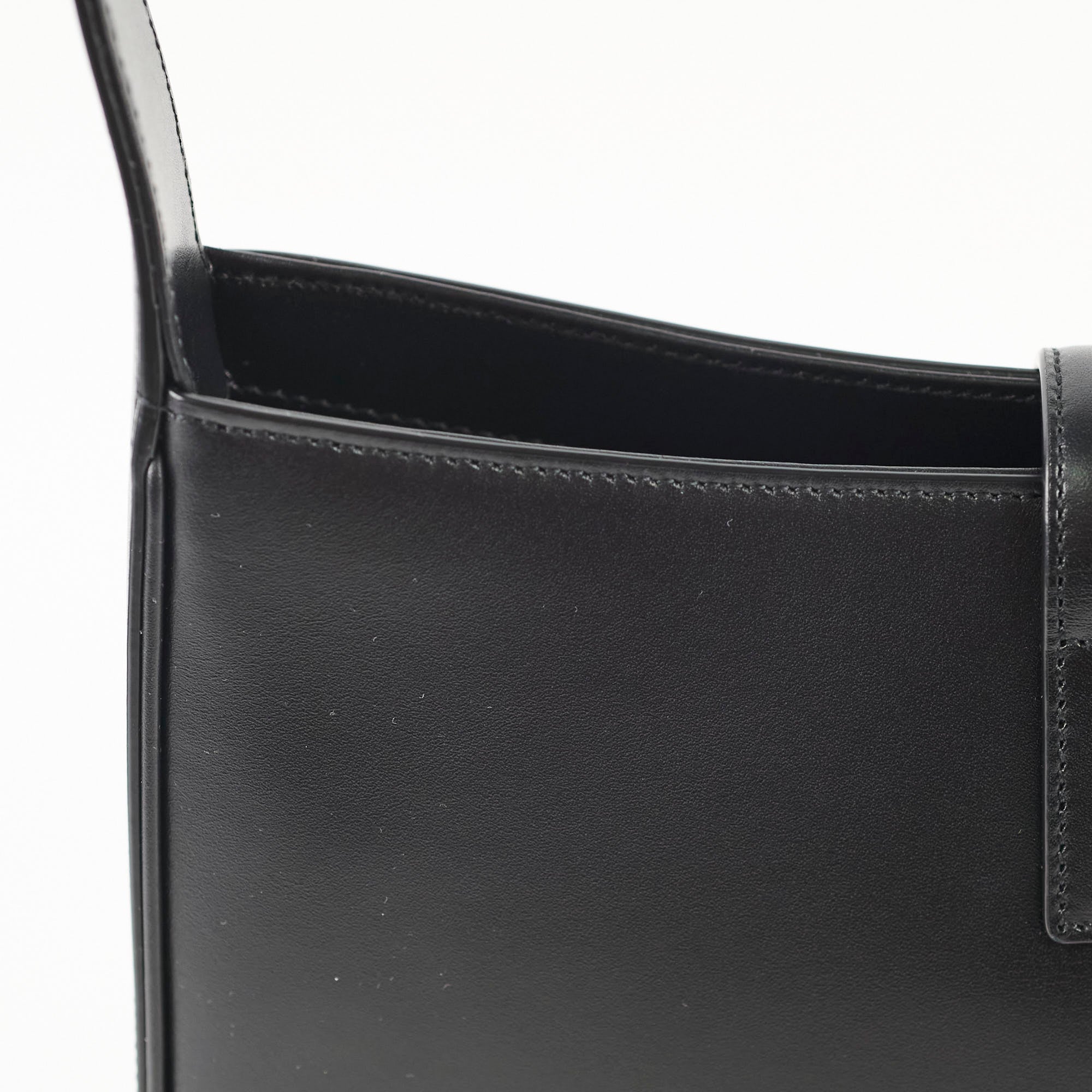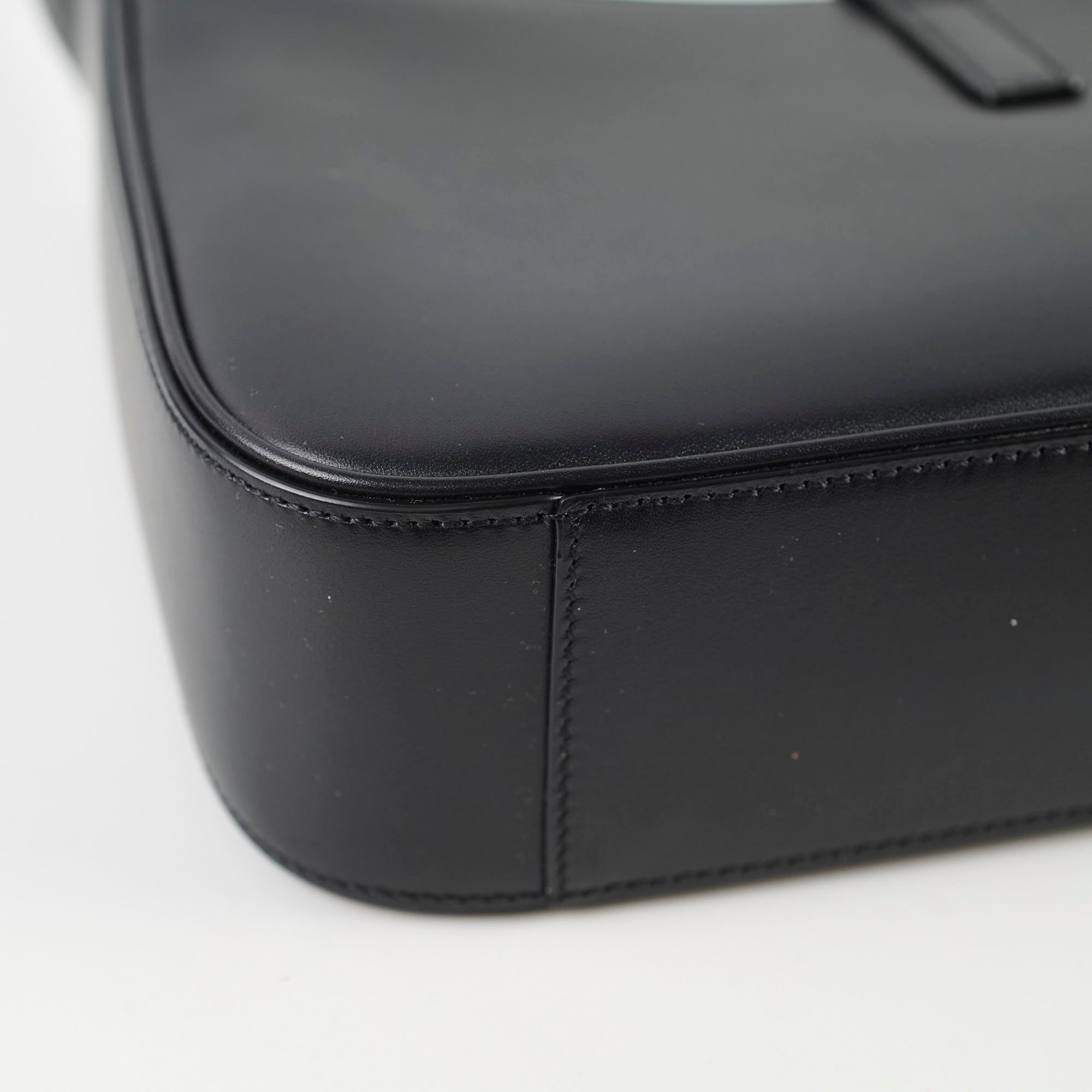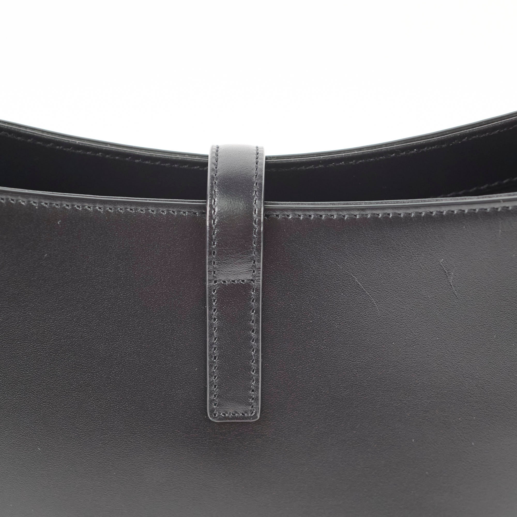 Light leather creasing on the handle, two scratches on the exterior, firm leather that remains like new, and light marks on the interior.