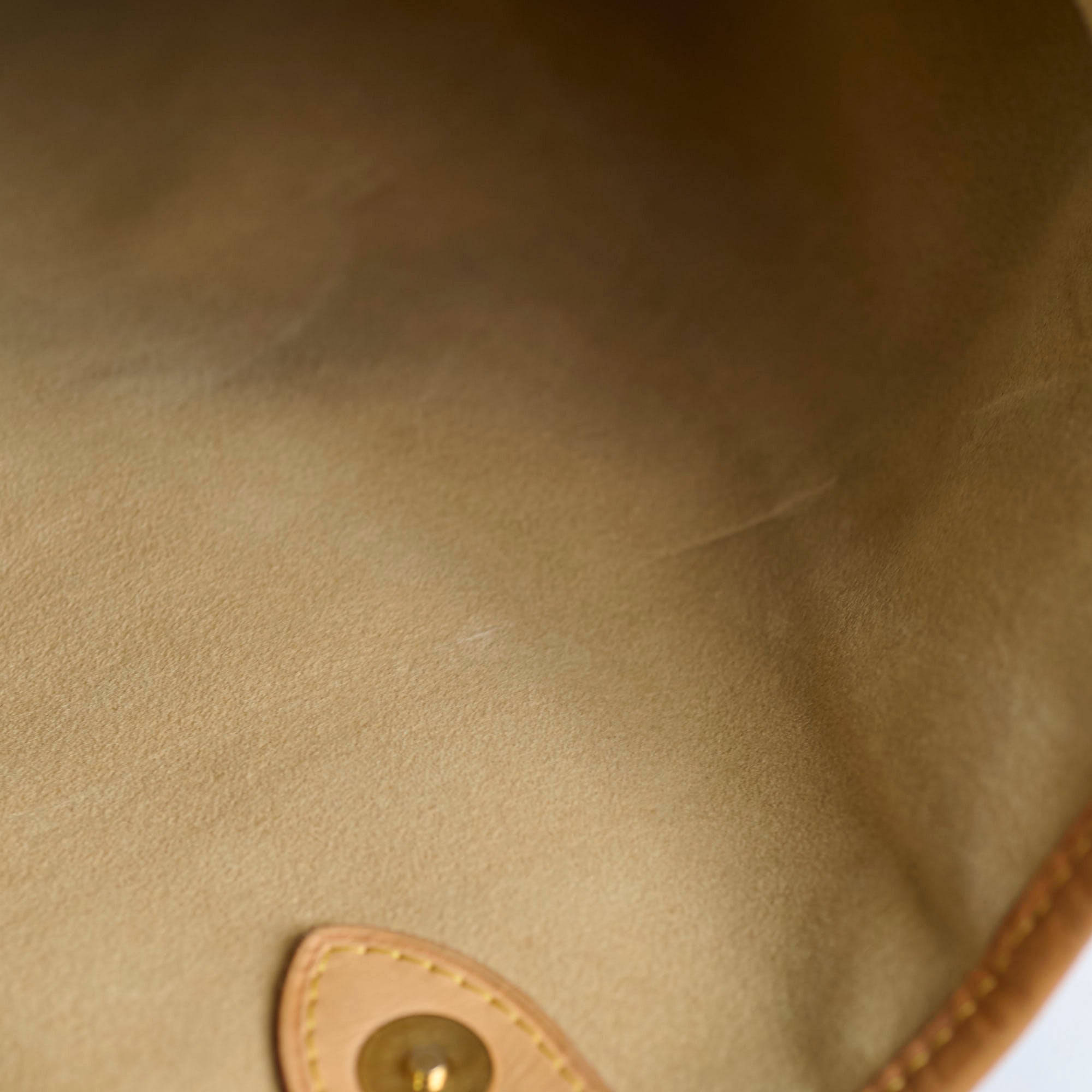 Even honey patina, scratch on the strap, hairline scratches on hardware, clean inside and out