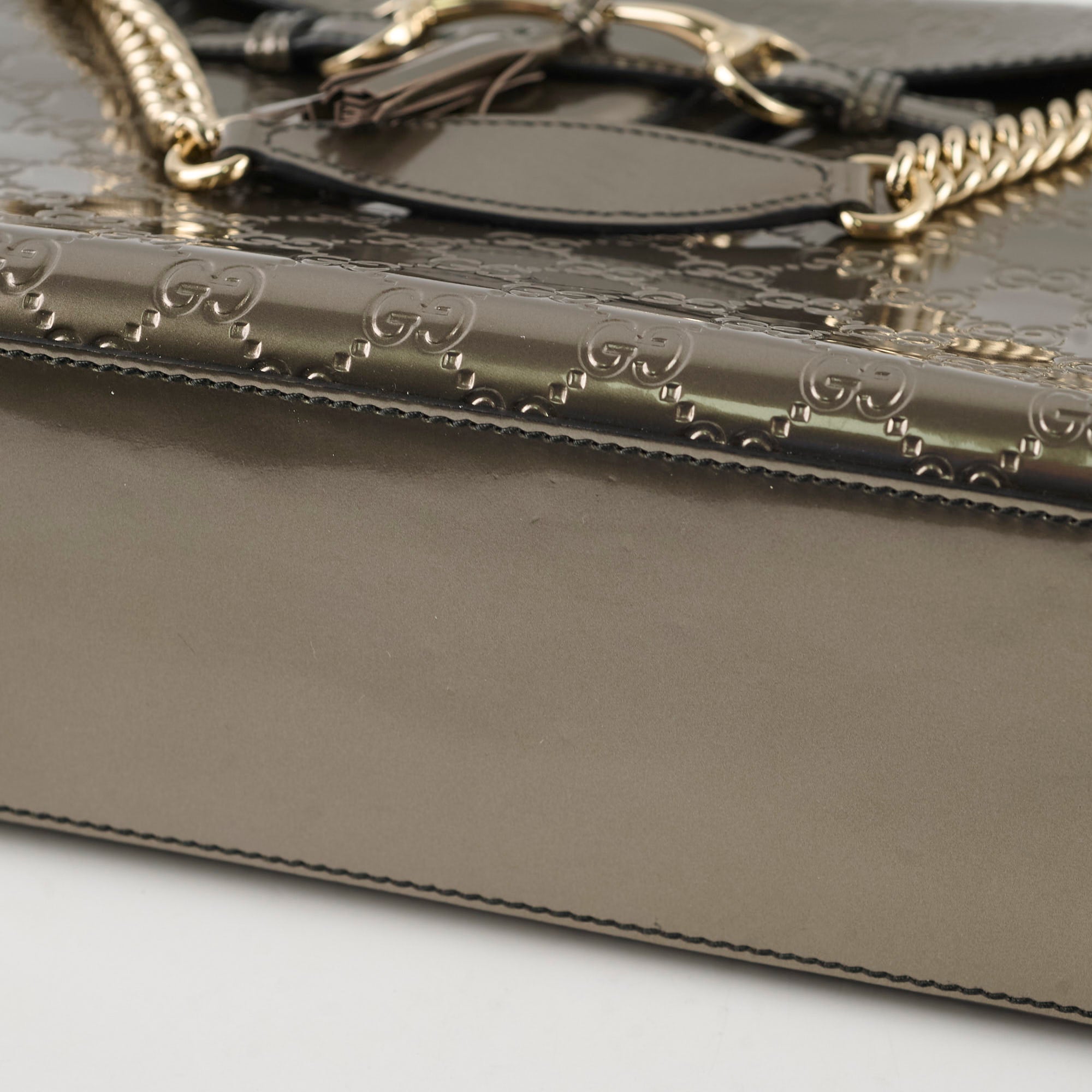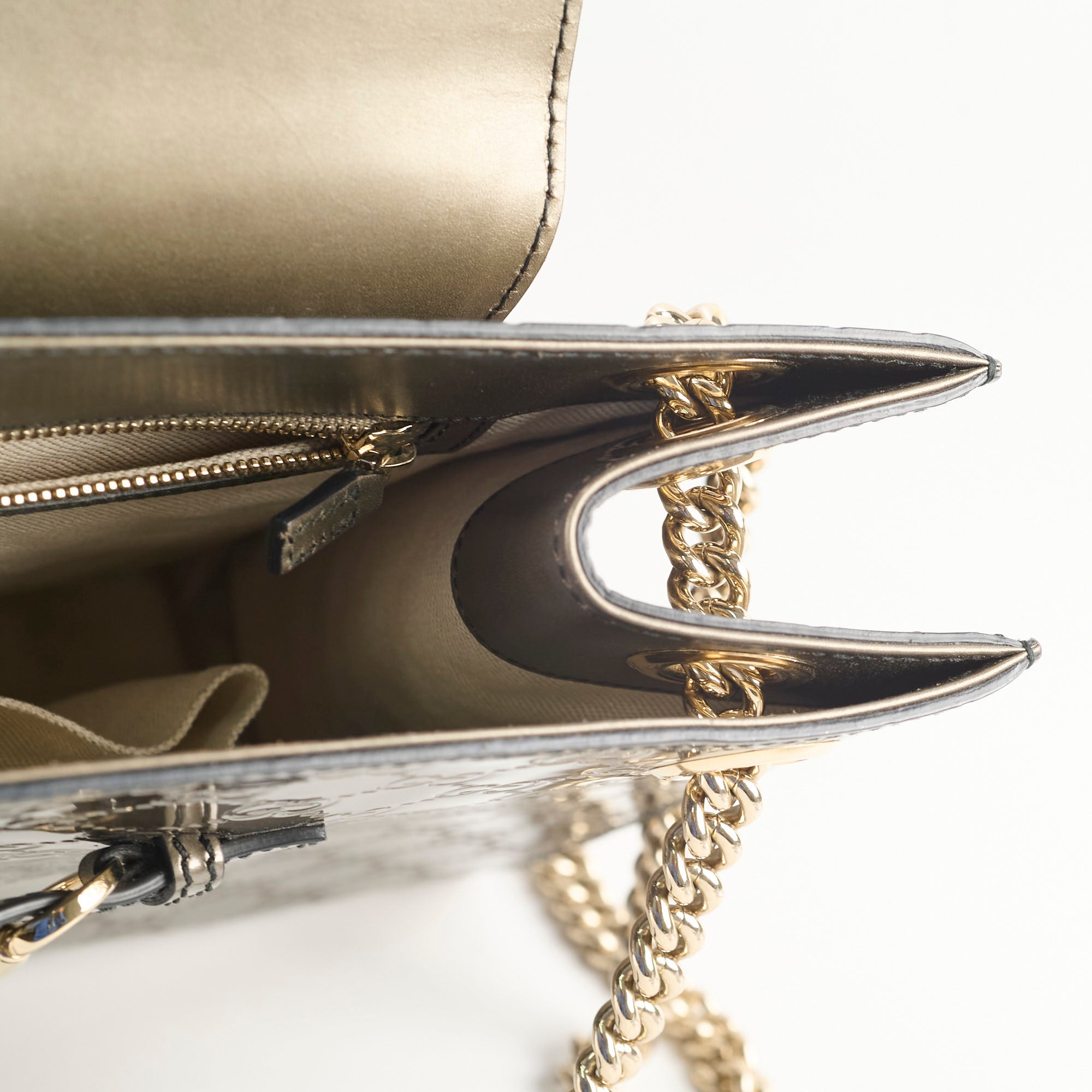 Minor scratches on the bottom and the interior. Minor hardware hairline scratches.