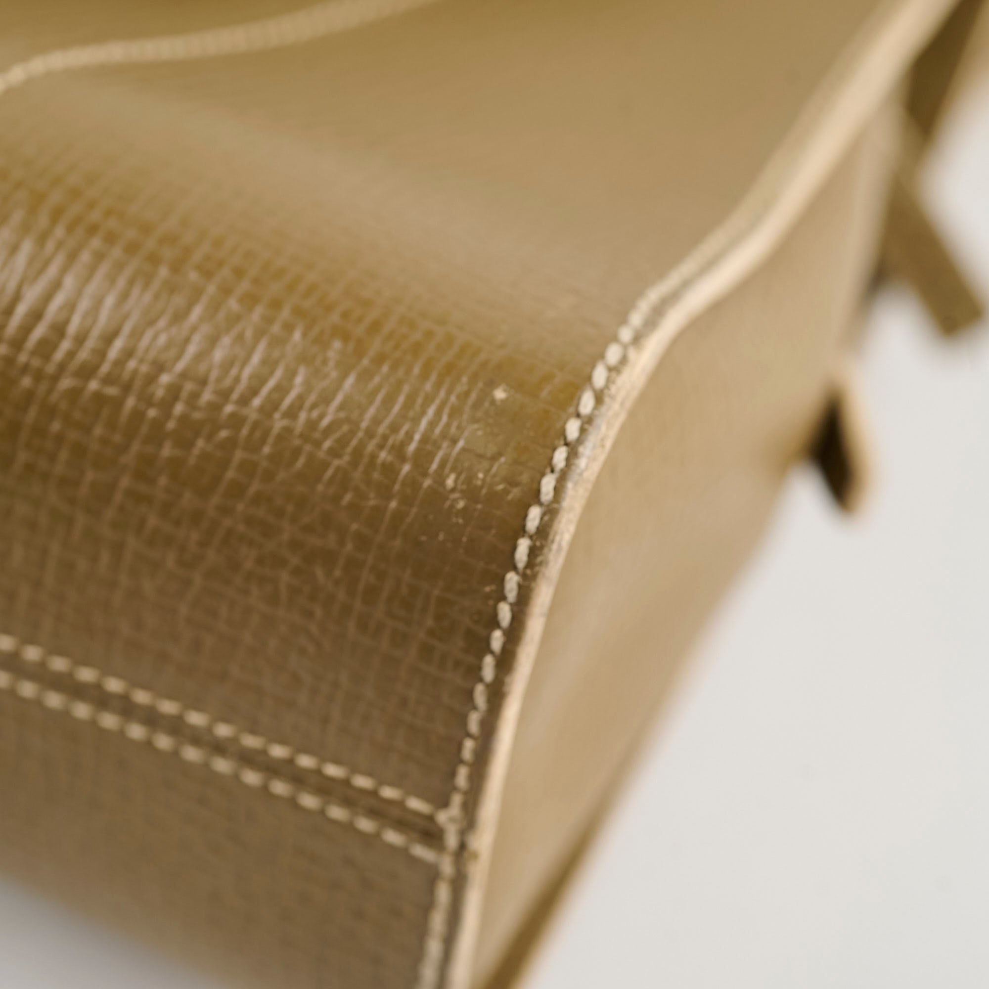 Light scratch on front, rubbing on corners/edges, minor leather fraying near d-ring, loose thread on handles/interior, overall great vintage condition