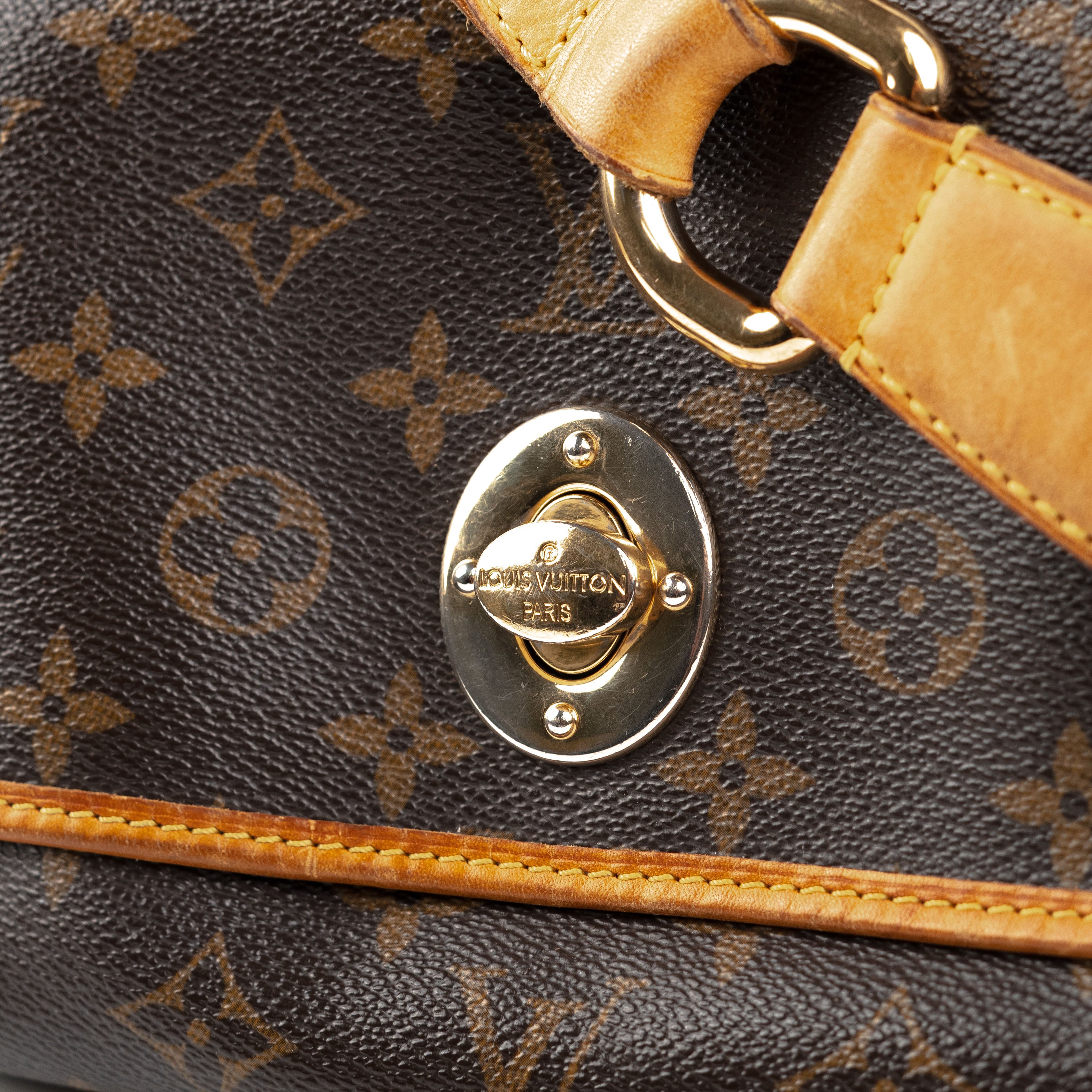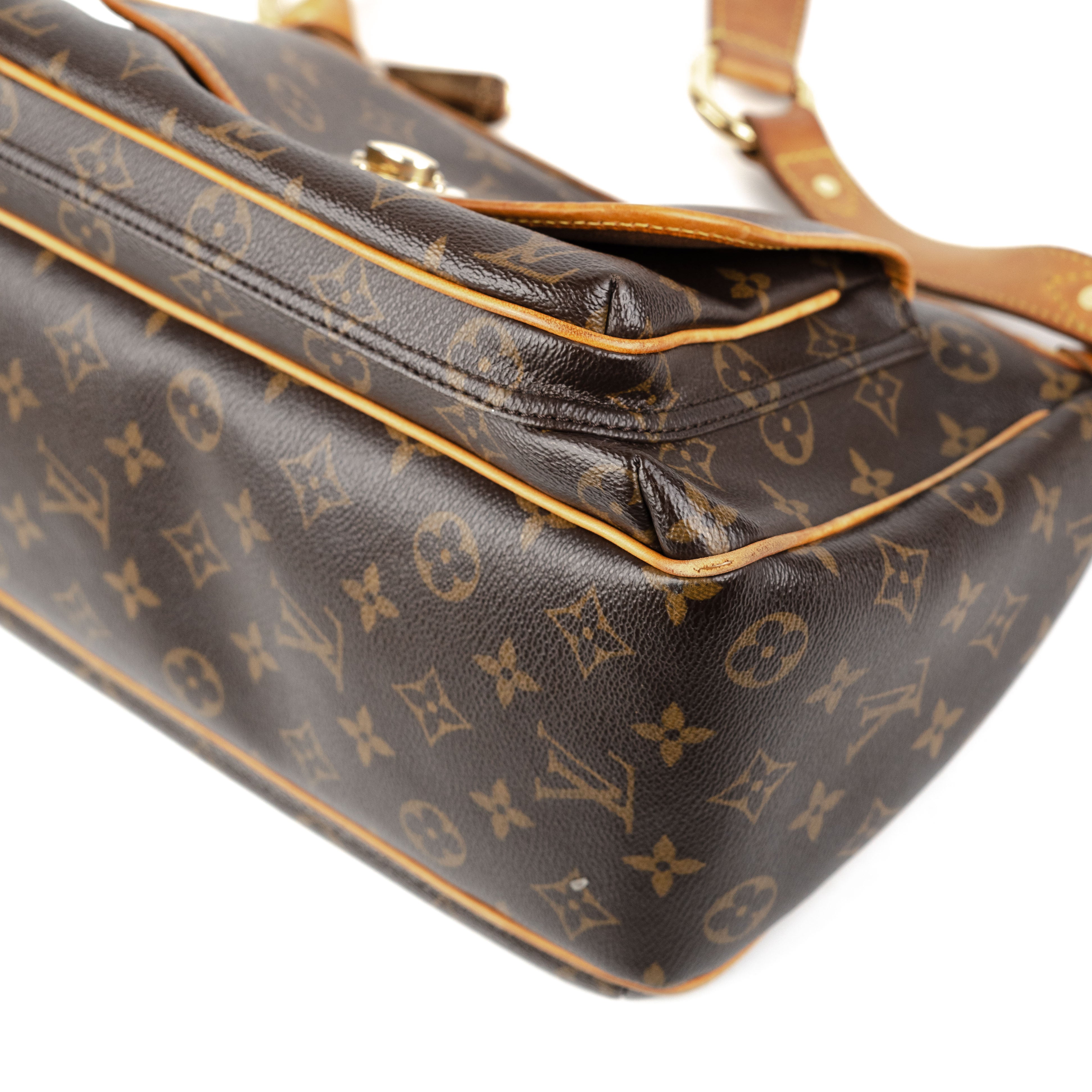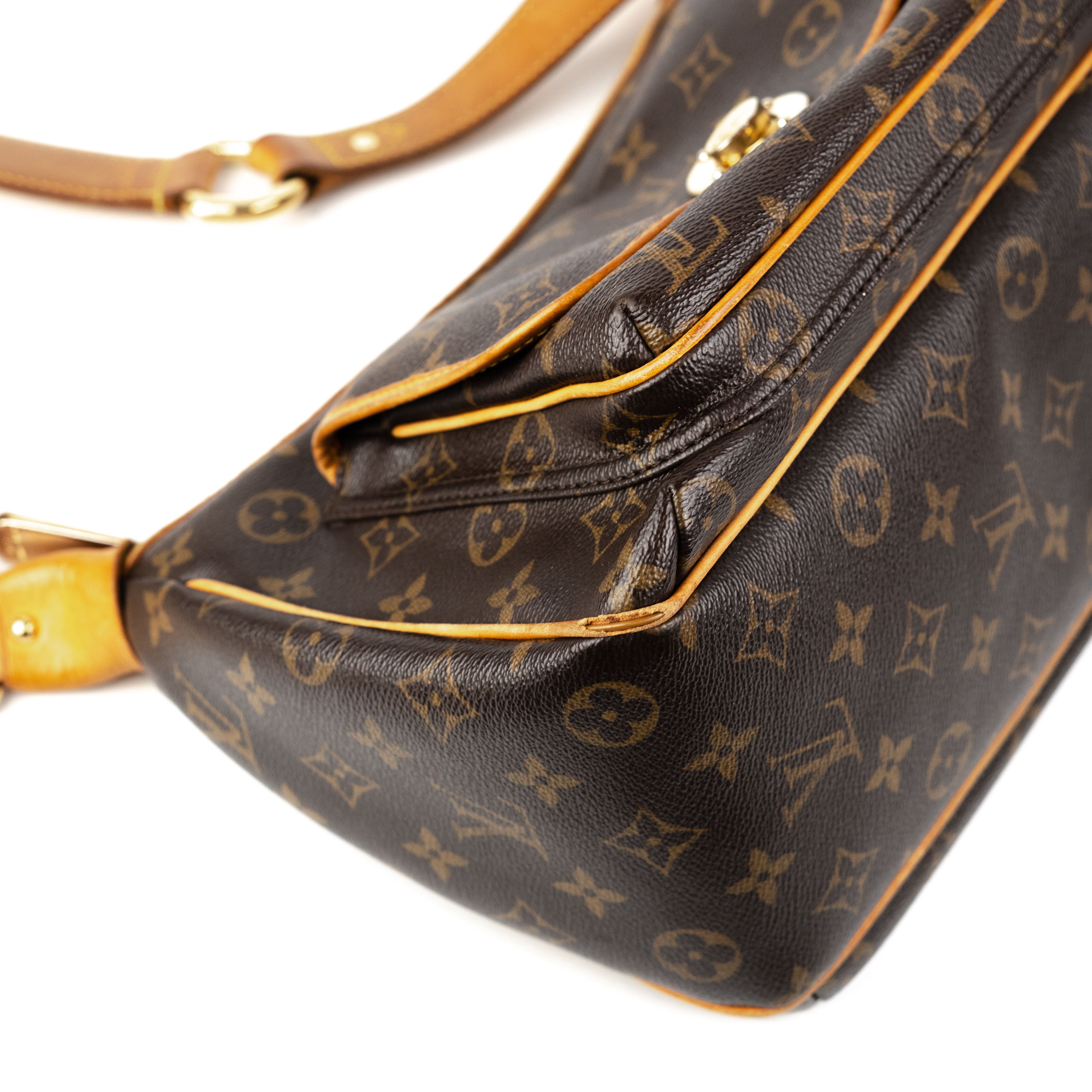 Signs of wear throughout on vachetta leather and piping, discolouration on hardware, tear on two corners