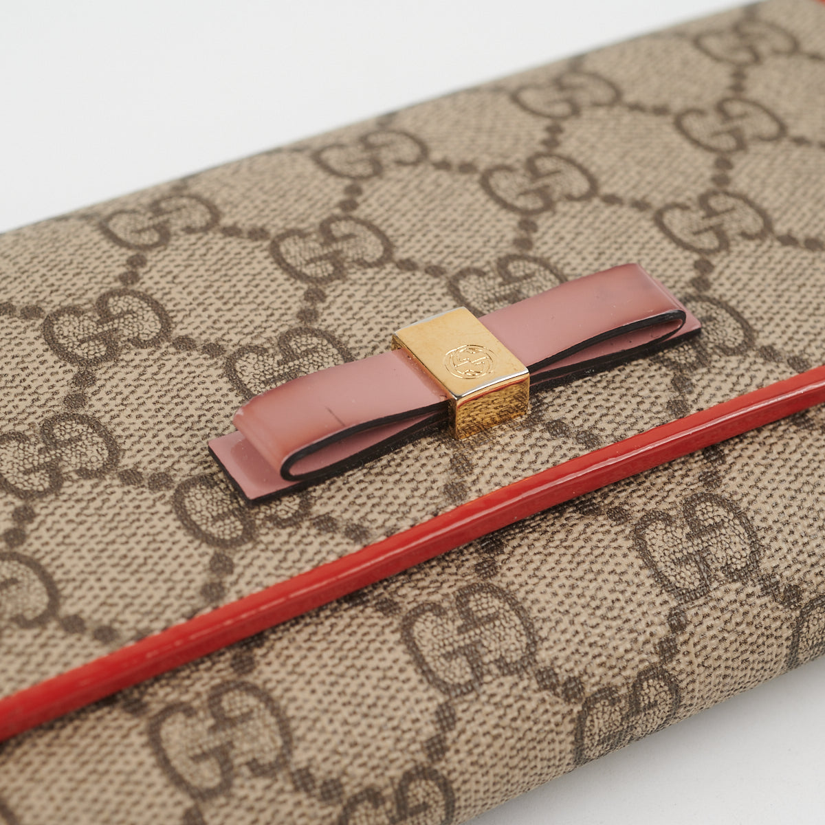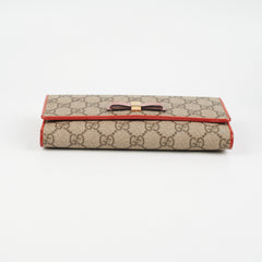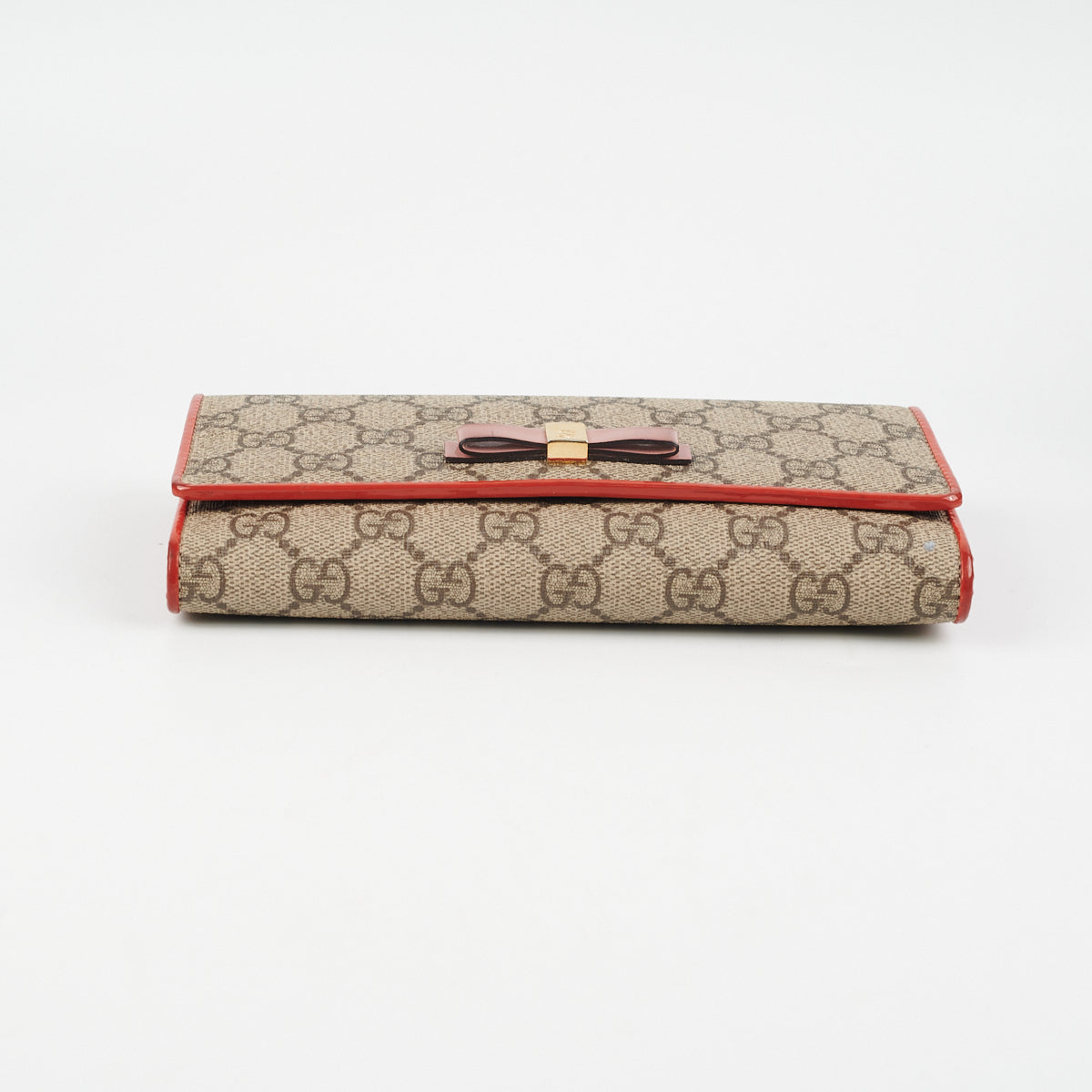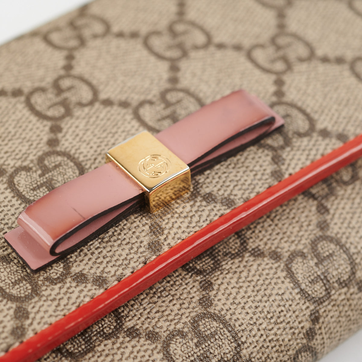 General signs of wear throughout, tarnishing and hairline scratches on hardware, darkened rubbing on bow and corners, flap indent on interior, small stain on right corner on canvas